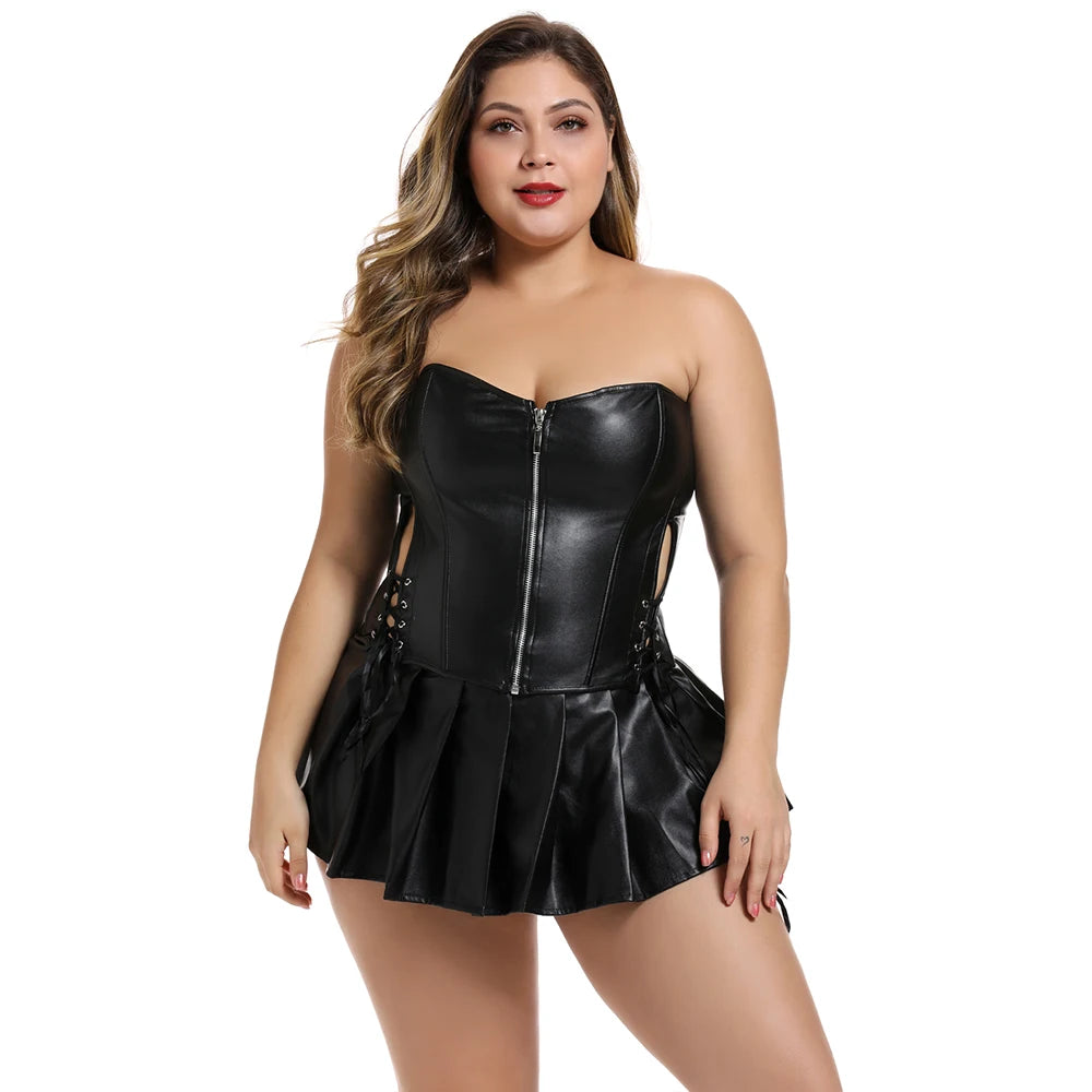 Gothic Corset Dress Set Faux Leather Front Zip Bustier Top With Mini Skirt