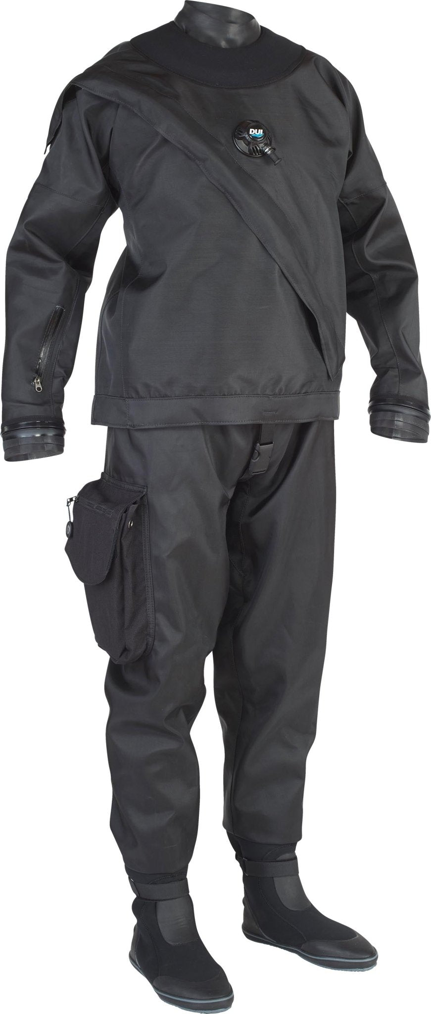 New in 2019, DUI now offers a custom-fitted Yukon II using our 20 measuring points. The Yukon II front-entry drysuit showcases DUI’s newest innovation, FreedomForm™ Technology. Since developing the original self-donning telescopic torso in 1980, we have continued to push the limits of drysuit design and manufacturing. This distinctive new inlay design provides an unrestricted range of motion to maximize comfort and flexibility while maintaining a streamlined form. This new design, paired with the nylon/butyl rubber/polyester trilaminate, provides unparalleled flexibility. In addition to attached UltraFlex boots, the latest boot technology where durability meets flexibility. The Yukon II ships standard with a large Cargo pocket complete with 2 interior compartments: 1 large section is a perfect fit for a spare mask, and the thinner pocket is ideal for wet-notes along with an external zippered pocket.