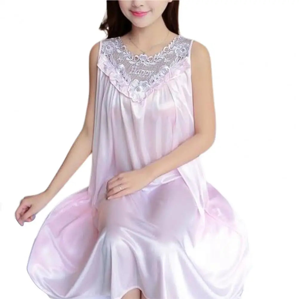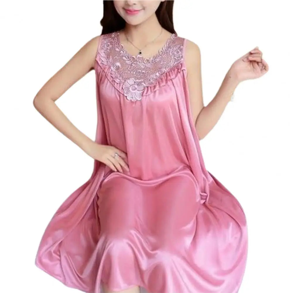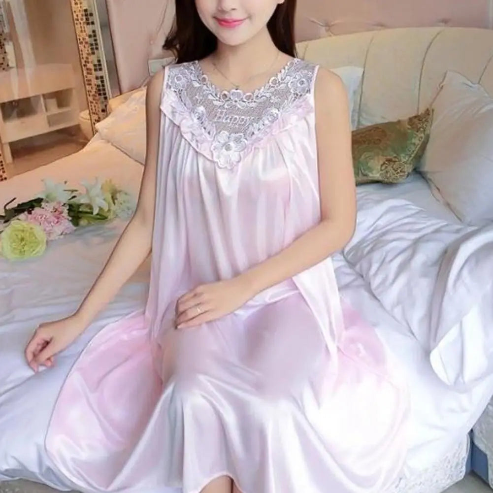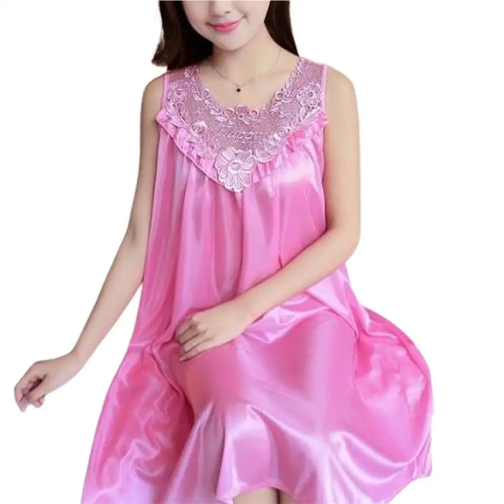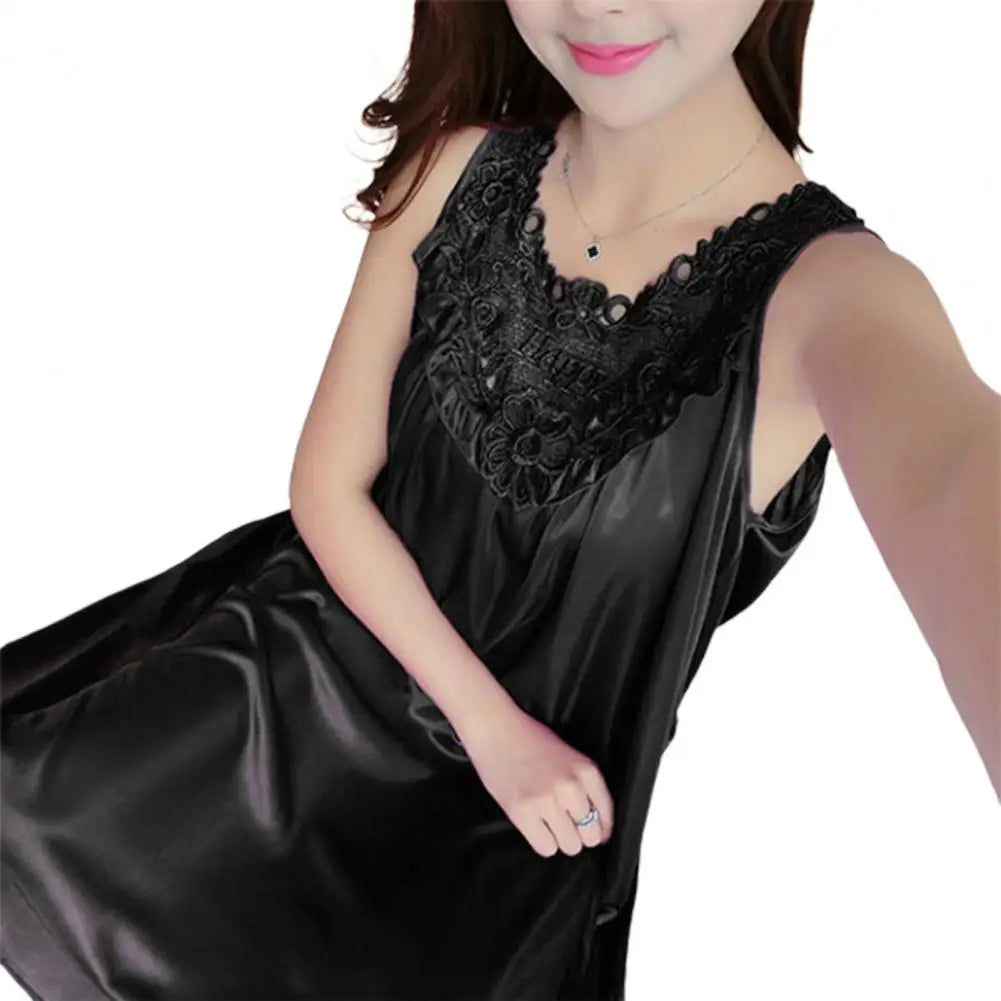 Female Nightgown Sleeveless Lace Stitching V-neck Sexy Women Faux Silk Sleepwear for Lady