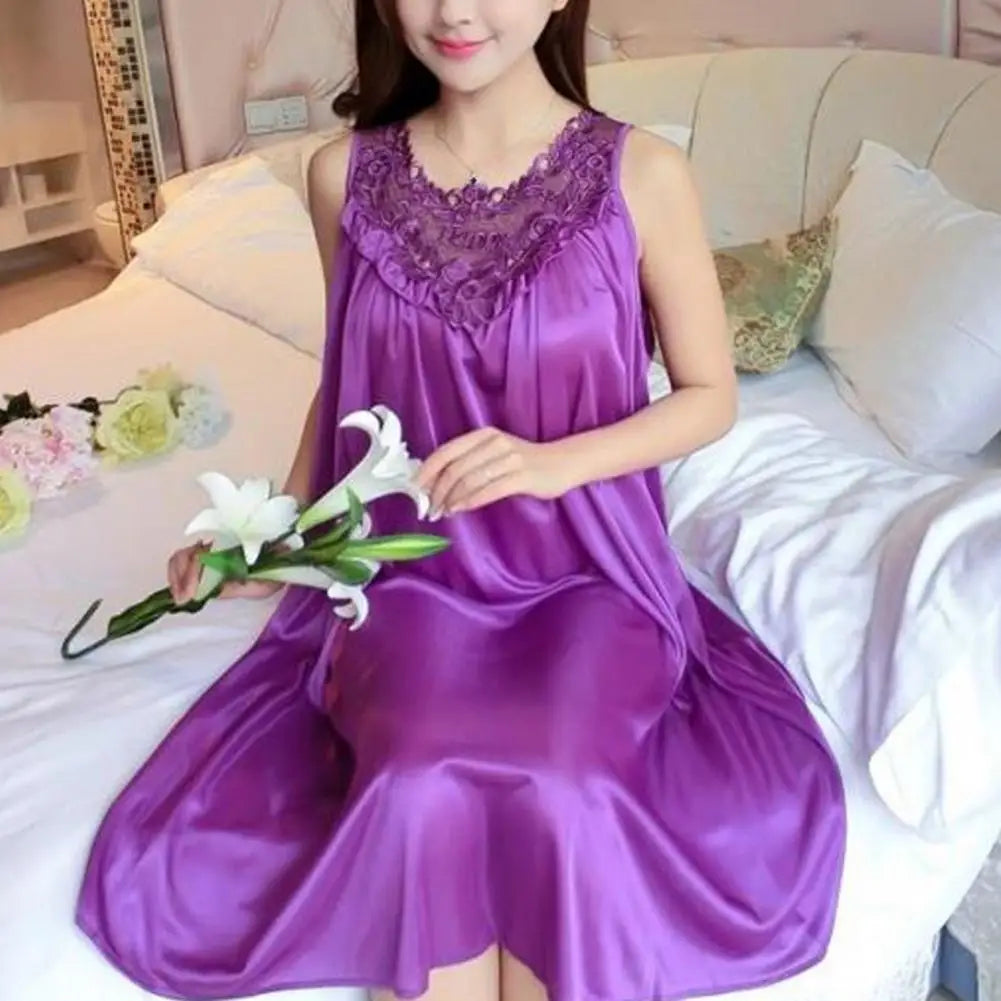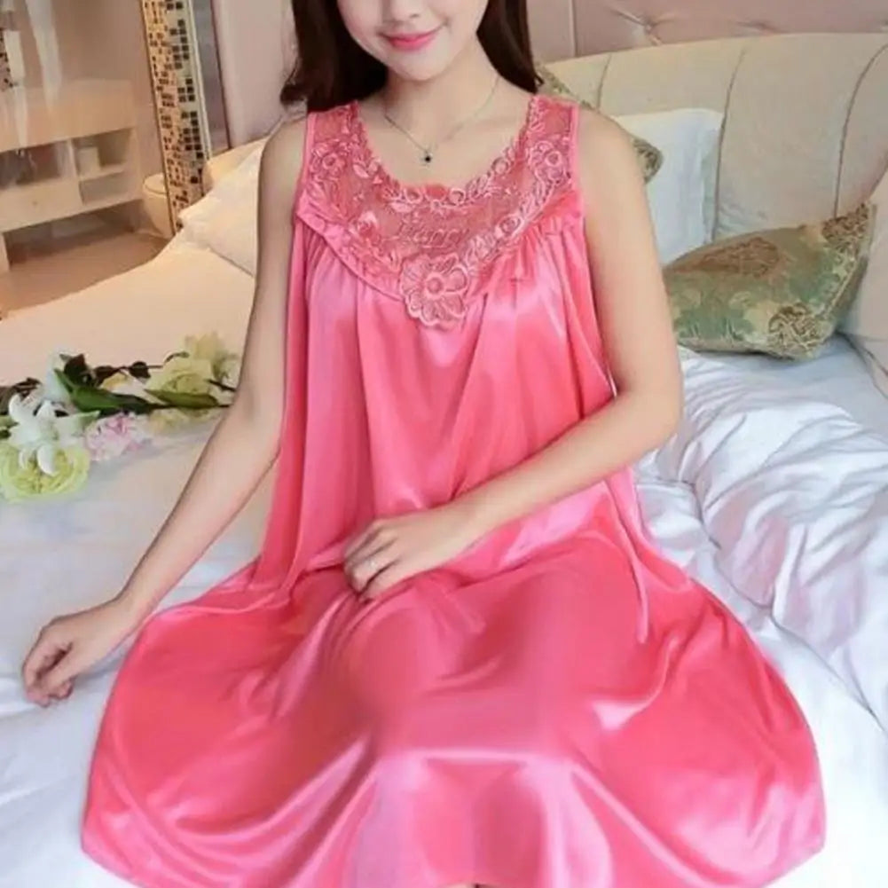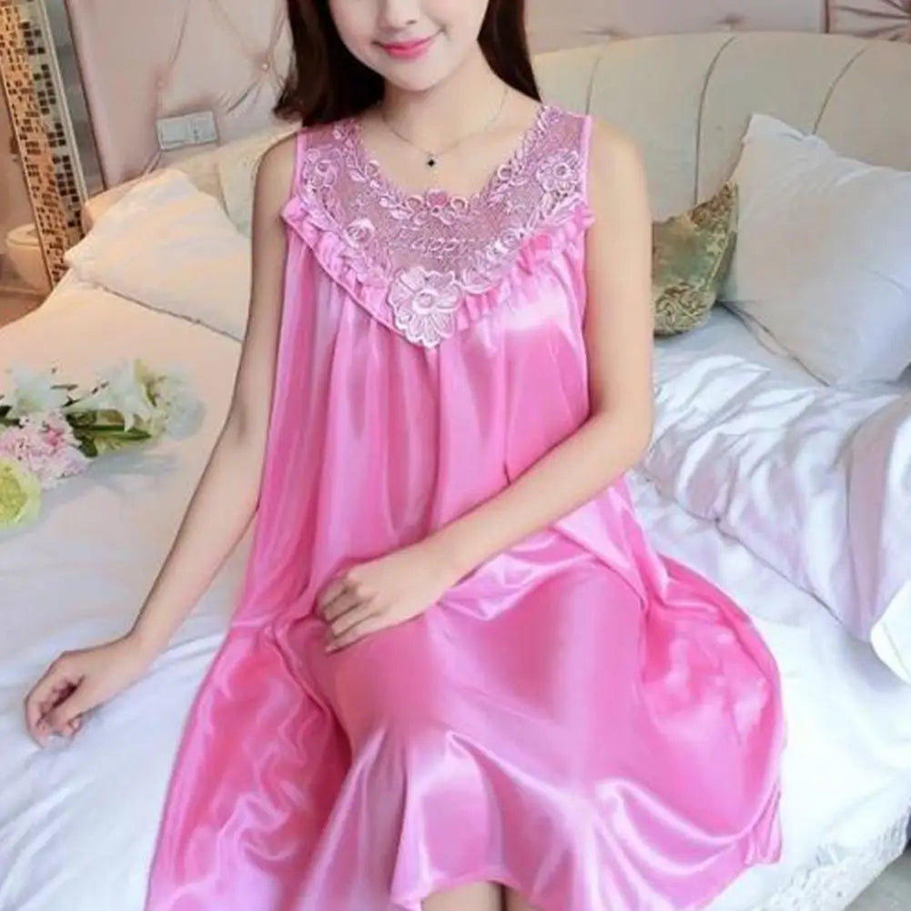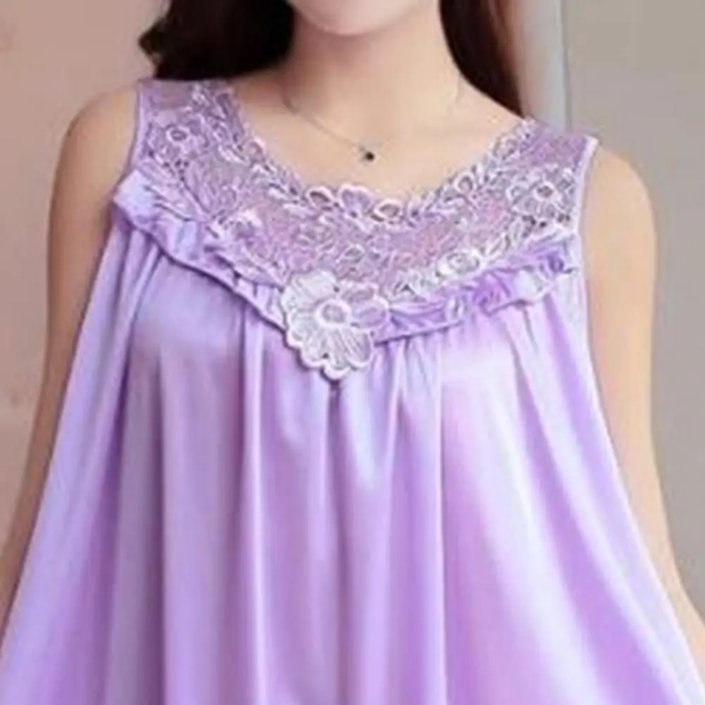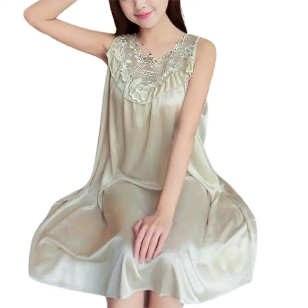 Female Nightgown Sleeveless Lace Stitching V-neck Sexy Women Faux Silk Sleepwear for Lady