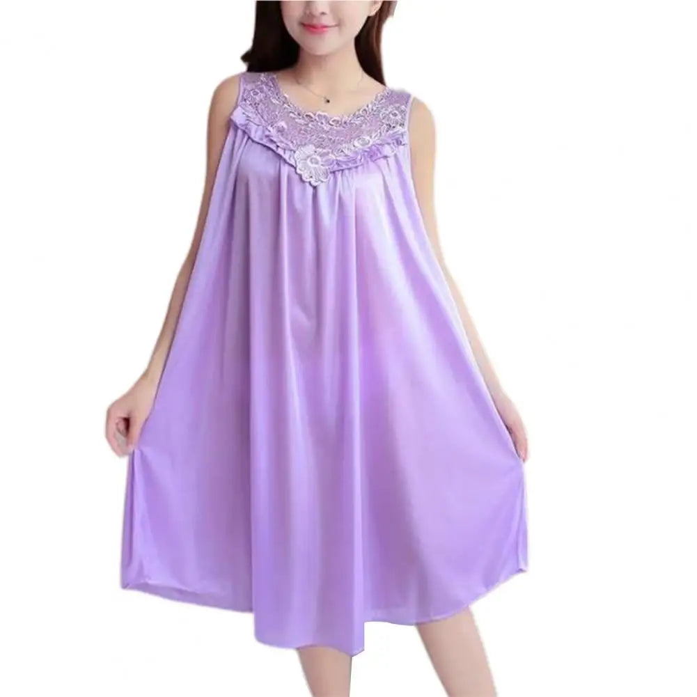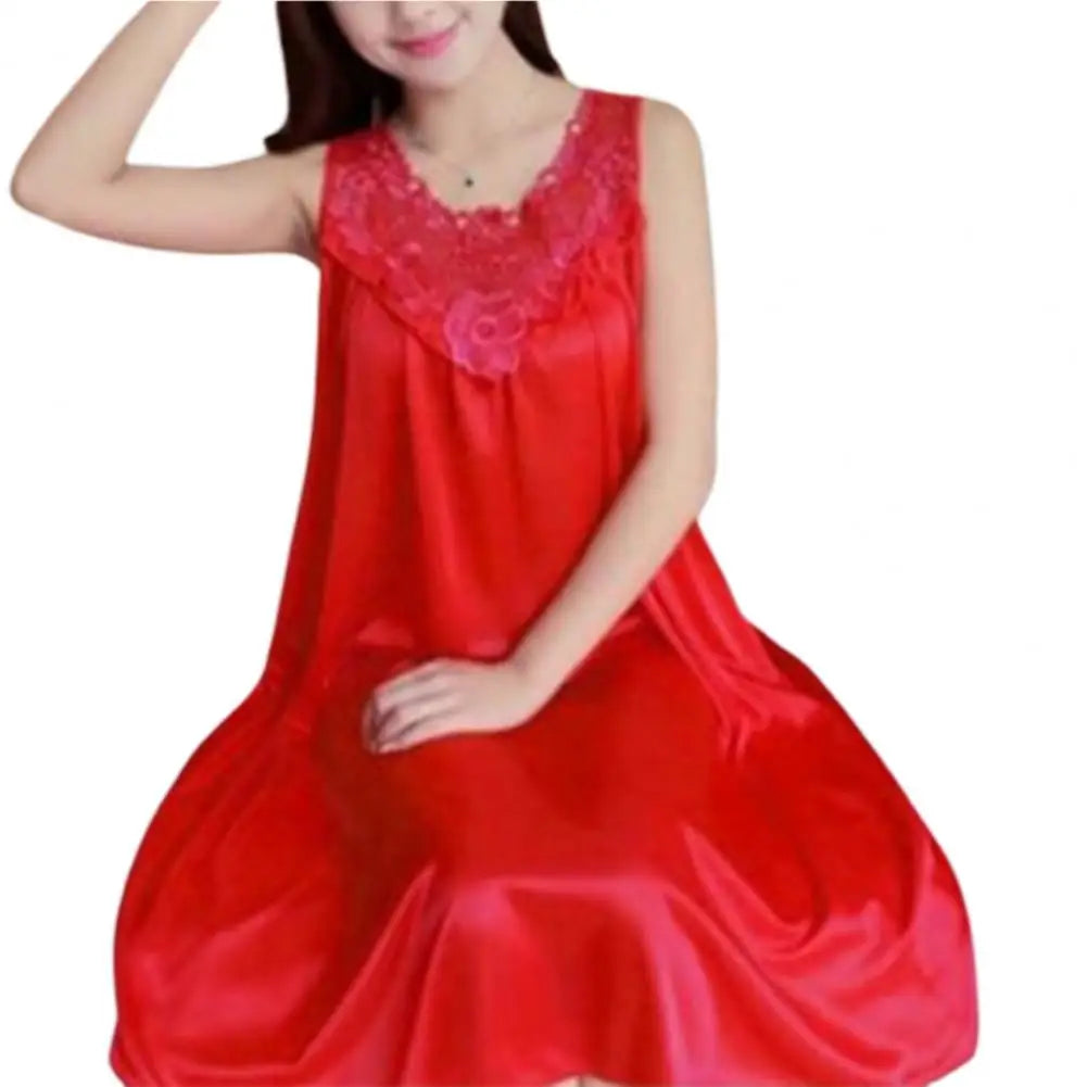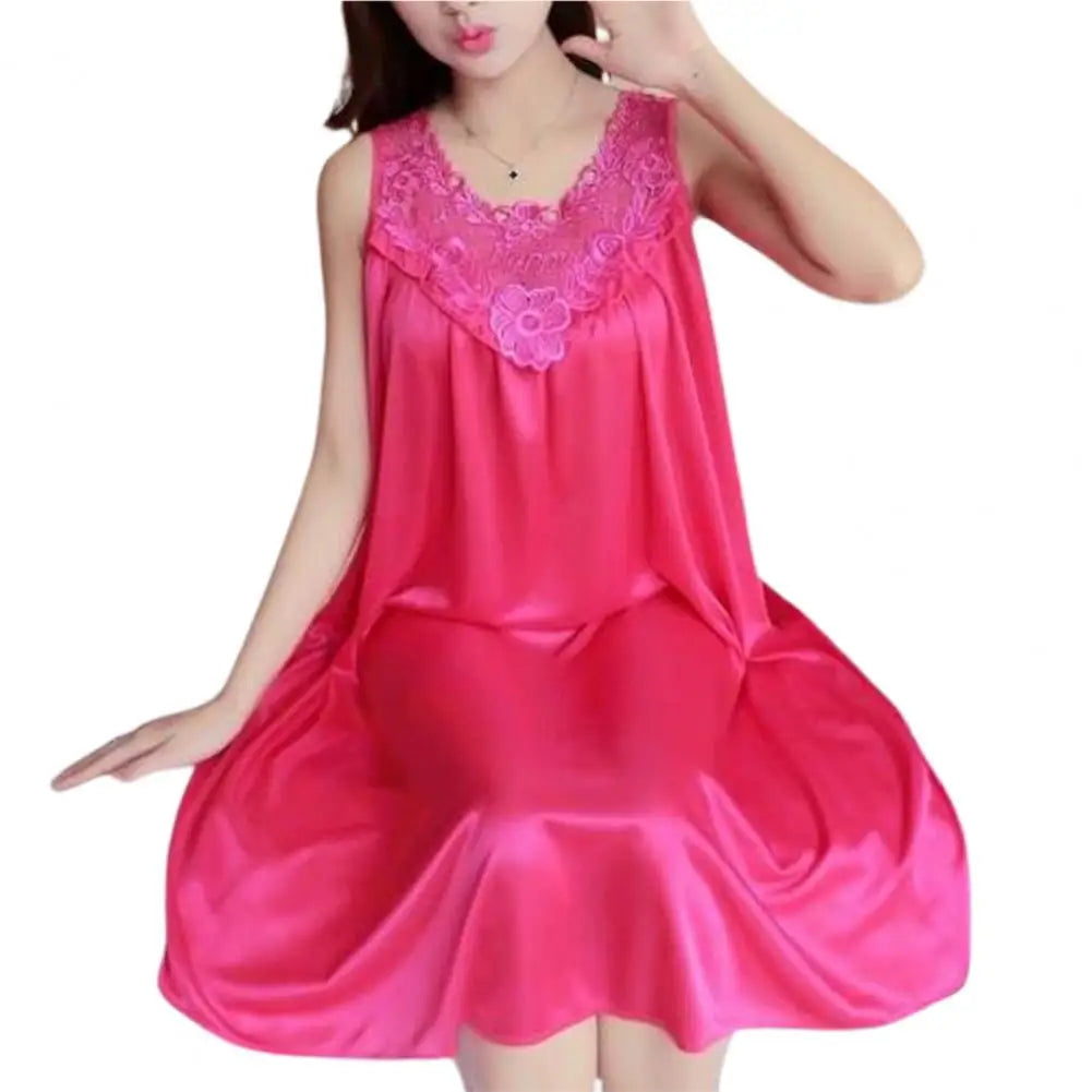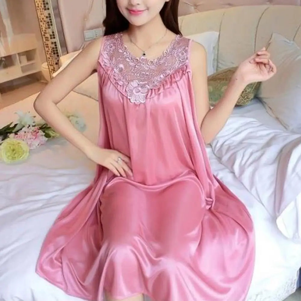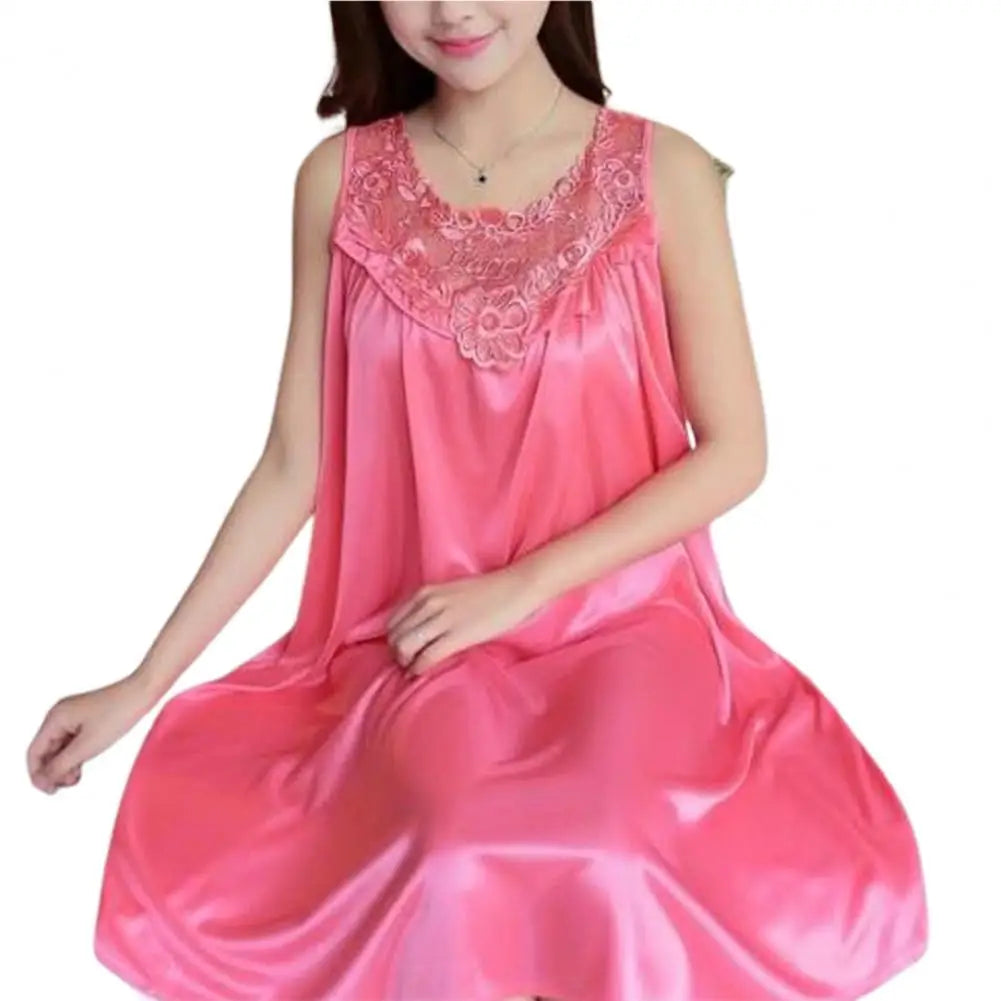 Female Nightgown Sleeveless Lace Stitching V-neck Sexy Women Faux Silk Sleepwear for Lady