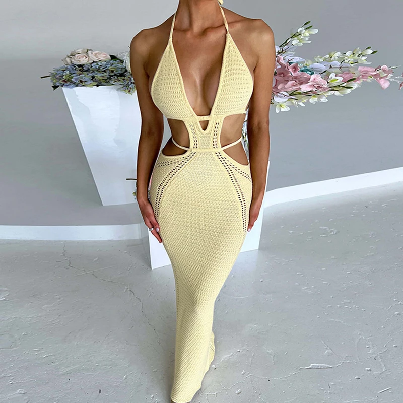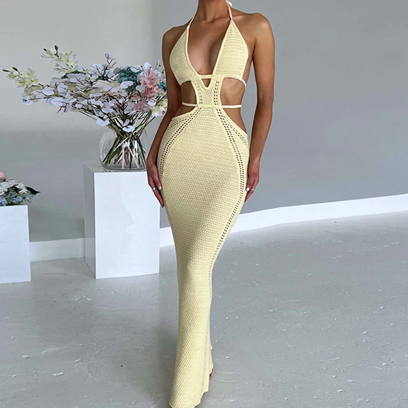 Sexy Style Hollow Out Backless Tie Up Dress Women Beach Vacation Beachwear Cover Up Knitting Sun Bathing Sunscreen Long Dress