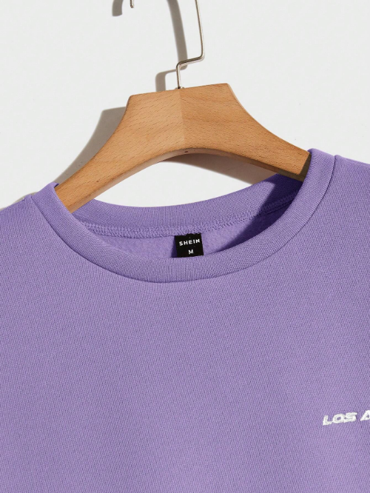 Color: Purple Style: Casual Type: Pullovers Pattern Type: Letter Neckline: Round Neck Sleeve Length: Long Sleeve Sleeve Type: Regular Sleeve, Drop Shoulder Length: Regular Fit Type: Regular Fit Fabric: Slight Stretch Material: Knitted Fabric Composition: 100% Polyester Care Instructions: Machine wash or professional dry clean Temperature: Spring/Fall 18-25℃/63-77℉ Sheer: No