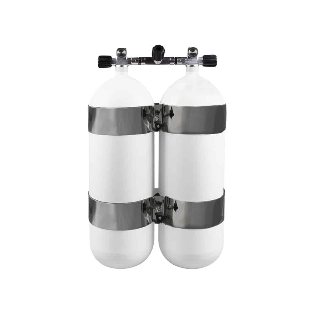 15 Liter Twinset Steel 230 Bar Manifold (Centre Isolator Valve) DIR Style 204mm Cylinder Diameter with rubber knobs and without Boot.