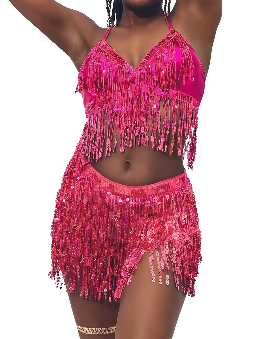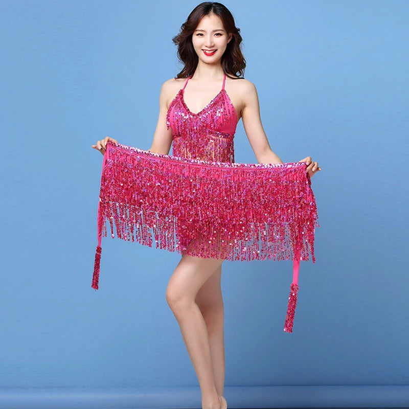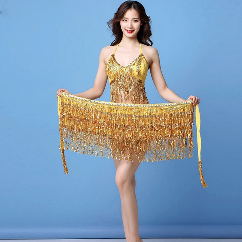 Belly Dance Top Bra Belt Set Latin Sequin Fringe Halter Hip Skirt Sexy Party Costume 4 Layer Tassel Stage Performance Cloth Wear
