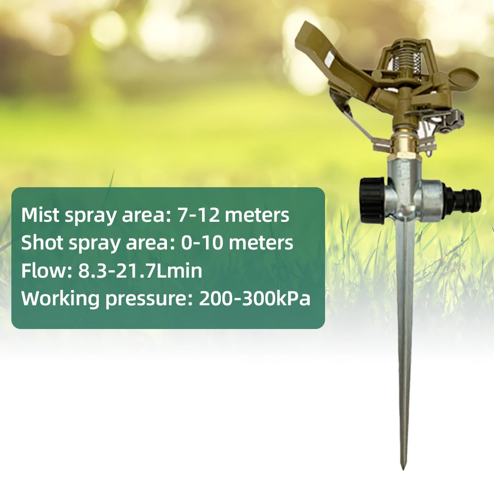 【Large Area Coverage】The garden sprinkler can cover about 7-12 meters mist spray area and 0-10 meters shot spray area. Flow: 8.3-21.7L/min. Working pressure: 200-300kPa.