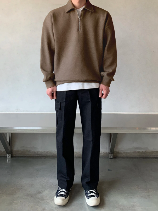 Color: Brown Style: Casual Type: Half Placket Pattern Type: Plain Details: Zipper Neckline: Collar Sleeve Length: Long Sleeve Sleeve Type: Drop Shoulder Length: Regular Fit Type: Oversized Fabric: Non-Stretch Material: Fabric Composition: 52% Polyester, 48% Cotton Care Instructions: Machine wash or professional dry clean Sheer: No