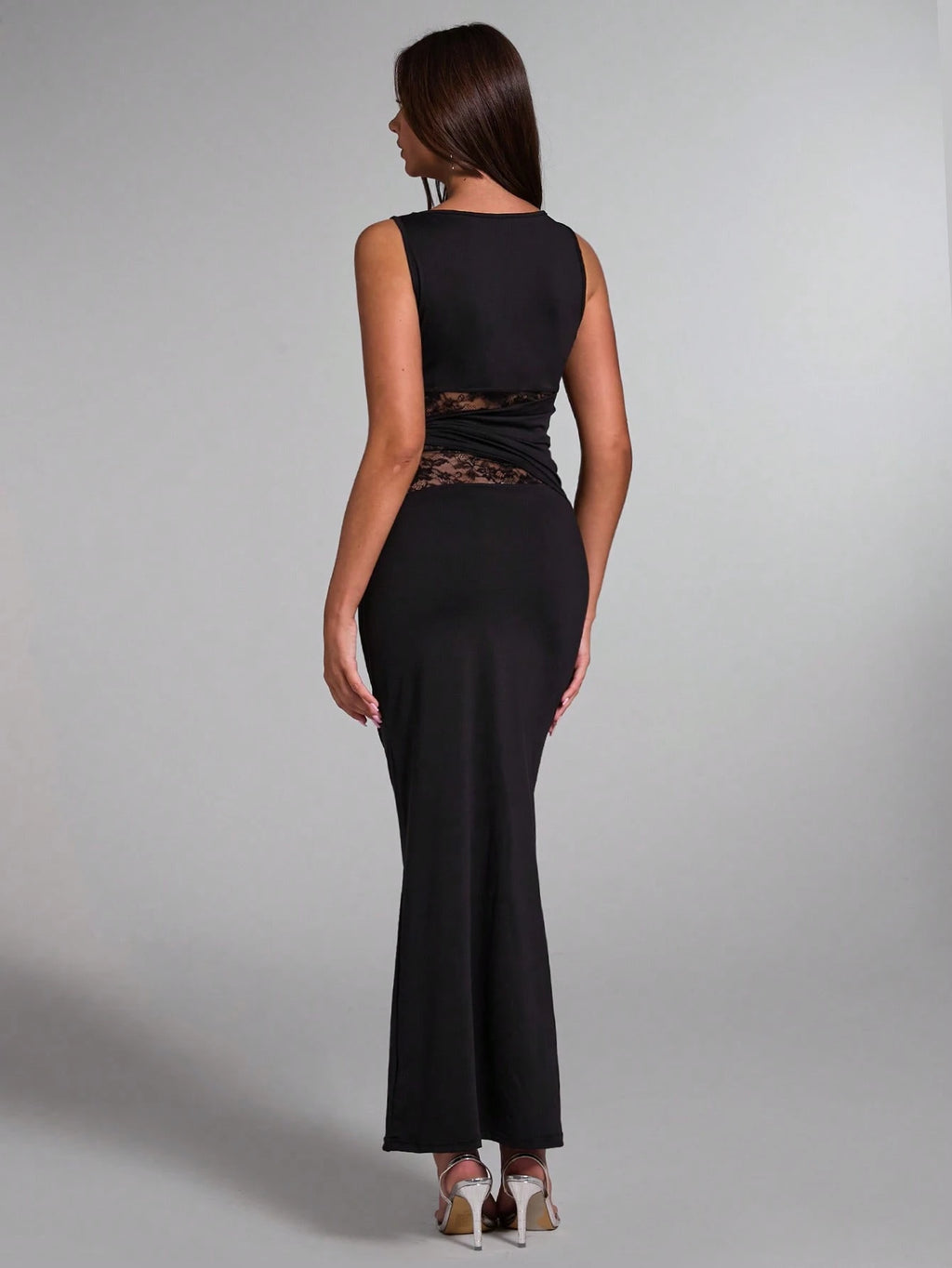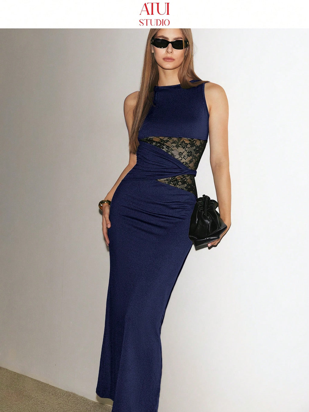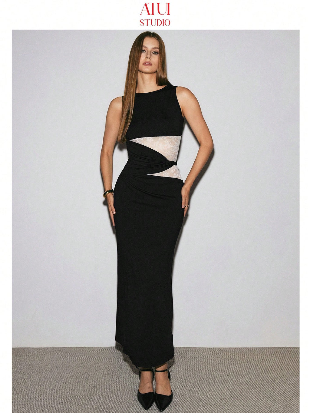 ATUI Studio Women's Black Elegant Lace Stitching Sincere Long Dress,Elegant Women Dresses,Party Women Outfits,New Years Women Dress,Black Women Dresses,New Years Women Outfit,New Year Party Dress