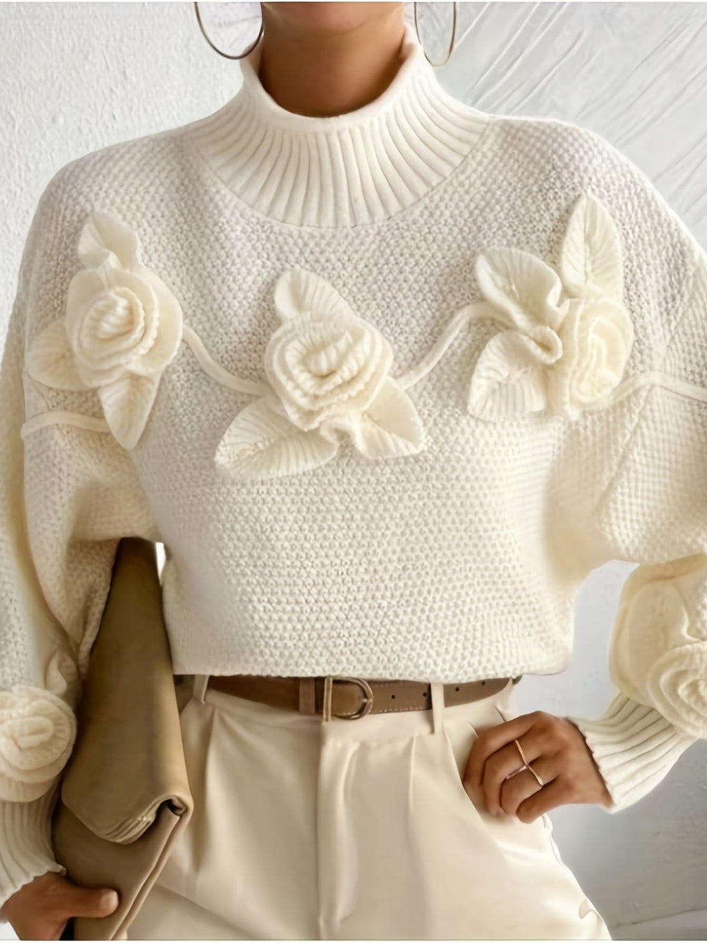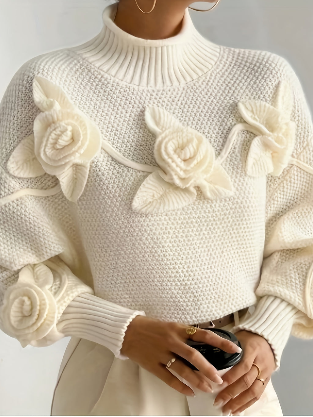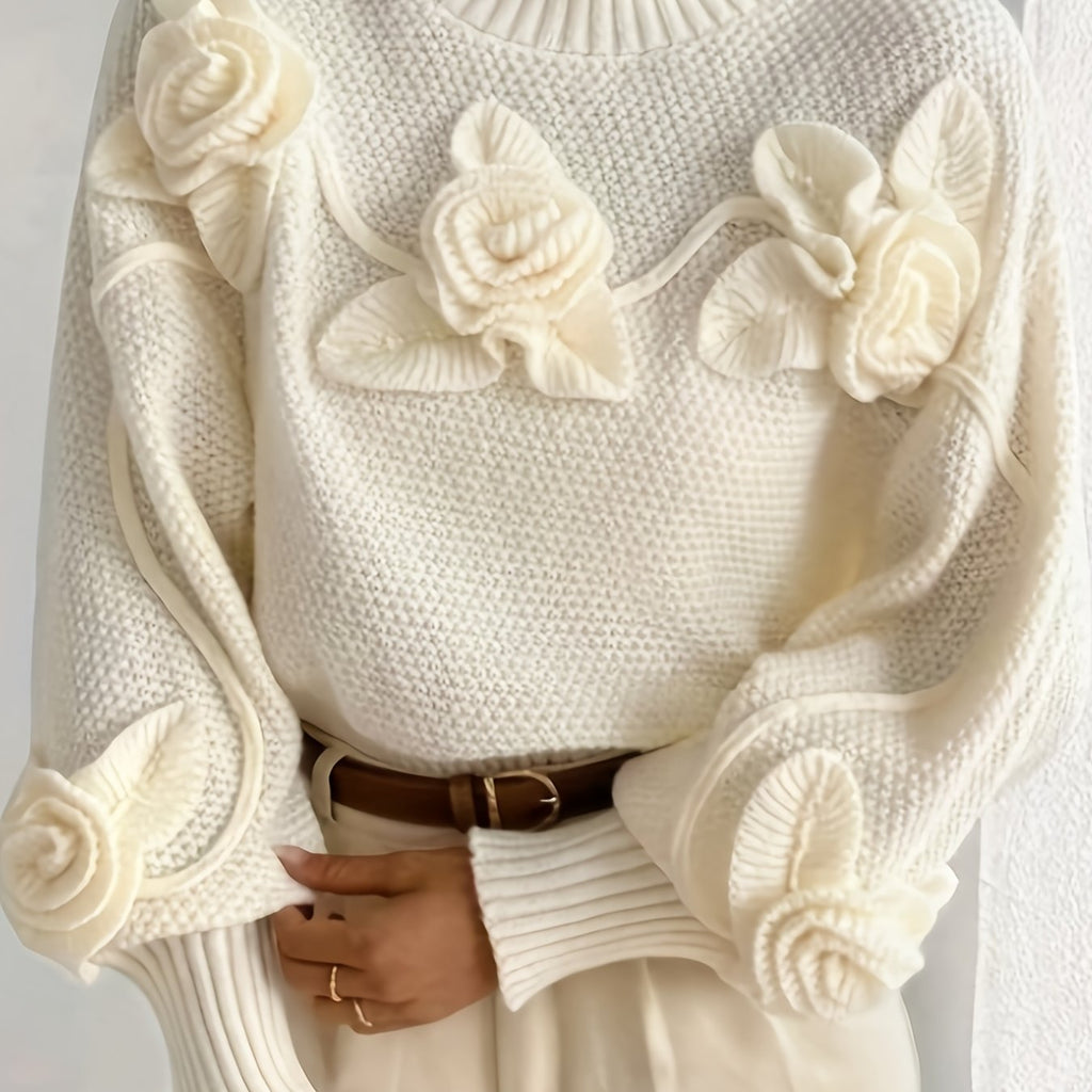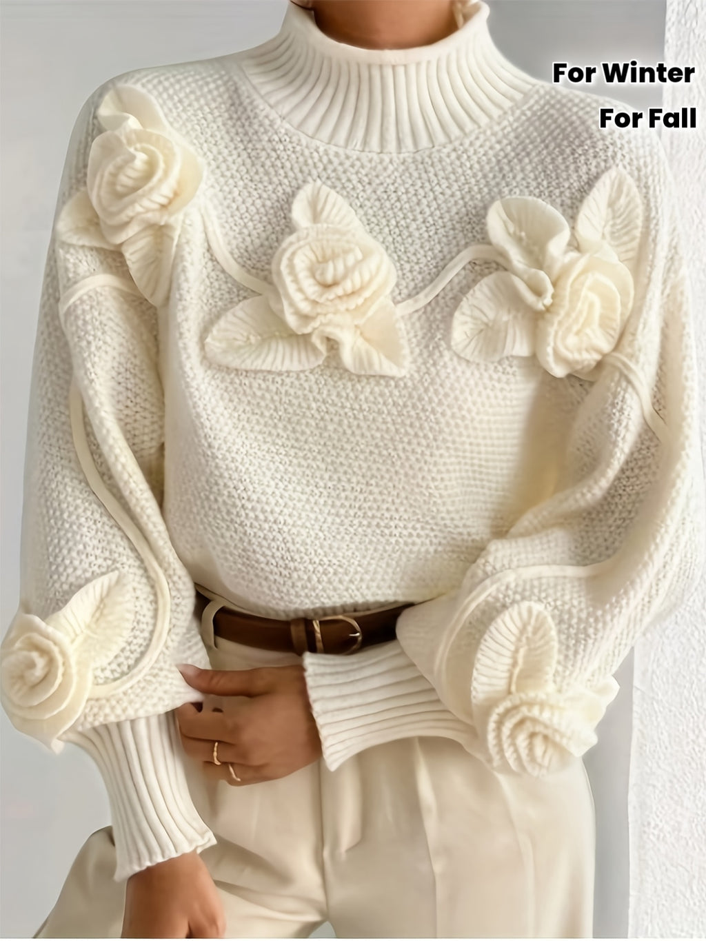 Elegant High-Neck Sweater with 3D Floral Embellishments – Soft, Plush, and Comfortable Fit, Perfect for Fall/Winter, Ideal for Creating a Serene Atmosphere, Casual Wear | Elegant Highneck | Construction, Sweater Dress