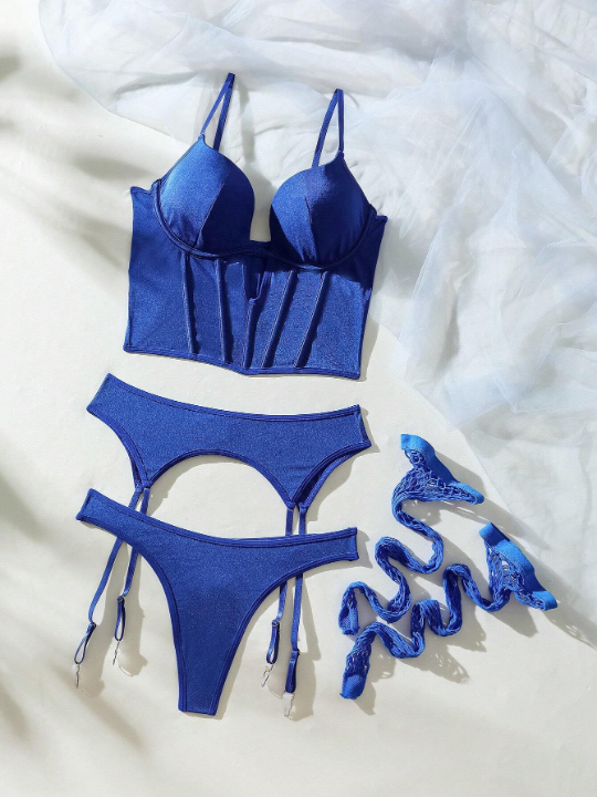 Color: Royal Blue Style: Fantasy-Mellow Type: Sexy Sets Neckline: Spaghetti Strap Details: Cut Out Number of Pieces: 3 Piece Set Bra Type: Plunge Panty Type: Thongs Rise: Mid Rise Fabric: Medium Stretch Care Instructions: Hand wash,do not dry clean Sheer: No Tops Material: Knitted Fabric Tops Composition: 85% Polyester, 15% Elastane