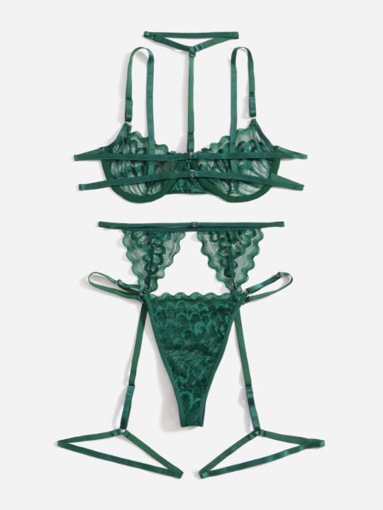 Color: Dark Green Neckline: Halter Type: Sexy Sets Pattern Type: Plain Panty Type: Thongs Number of Pieces: 3 Piece Set Rise: Low Rise Details: Cut Out, Sheer, Ring Fabric: High Stretch Care Instructions: Hand wash,do not dry clean Tops & Pants Material: Fabric Tops & Pants Composition: 65% Polyester, 35% Polyamide