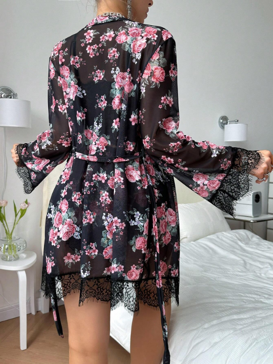 Wires: Wireless Color: Black Neckline: Spaghetti Strap Type: Robes Pattern Type: Plain Style: Fantasy-Elegant Bra Type: Longline, Bralettes Panty Type: Boyshorts Number of Pieces: 3 Piece Set Rise: Mid Rise Details: Contrast Lace, Sheer, Belted Tops & Body Accessories Material: Fabric Fabric: Medium Stretch Cup Type: Triangle Cup Care Instructions: Hand wash,do not dry clean Sheer: Yes Tops & Body Accessories Composition: 95% Polyester, 5% Elastane