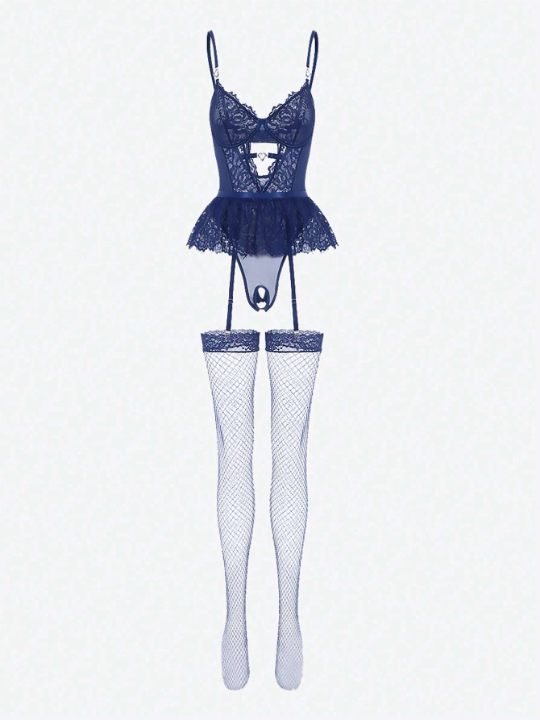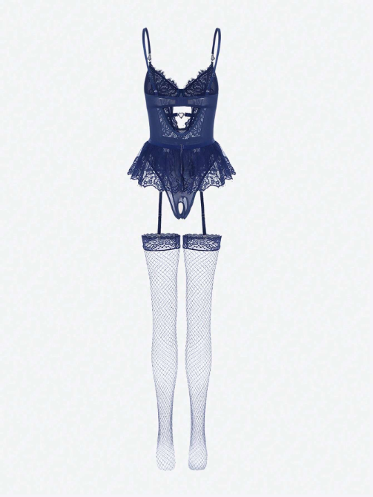 Color: Royal Blue Type: Teddies Neckline: V neck Details: Contrast Lace, Contrast Mesh, Cut Out Number of Pieces: 4 Piece Set Bra Type: Push Up Panty Type: Cheeky Body Accessories Material: Lace Bodysuits Material: Mesh Fabric Fabric: Medium Stretch Care Instructions: Hand wash,do not dry clean Sheer: Yes Support: High Support Body Accessories Composition: 100% Polyamide Bodysuits Composition: 94% Polyester, 6% Elastane