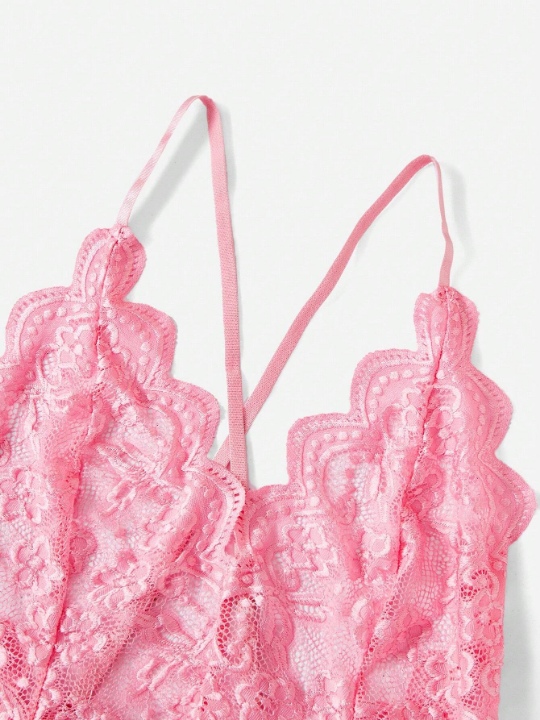 Color: Pink Type: Teddies Neckline: Spaghetti Strap Details: Criss Cross, Scallop Fabric: Slight Stretch Material: Lace Composition: 95% Polyester, 5% Elastane Care Instructions: Hand wash,do not dry clean