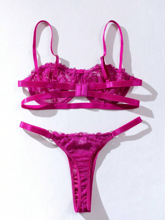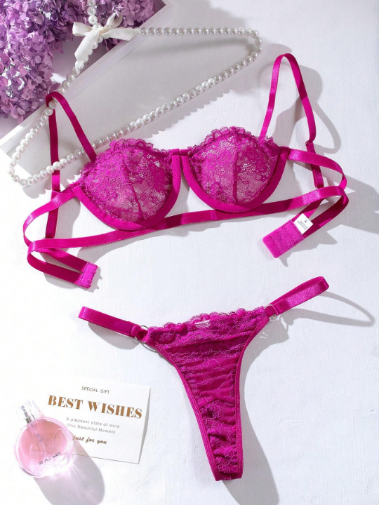 Color: Red Violet Neckline: Spaghetti Strap Type: Sexy Sets Pattern Type: Plain Bra Type: Demi Bras Panty Type: Thongs Number of Pieces: 2 Piece Set Rise: Mid Rise Details: Cut Out, Sheer, Ring Fabric: Slight Stretch Care Instructions: Machine wash or professional dry clean Tops & Pants Material: Fabric Tops & Pants Composition: 87% Polyamide, 13% Elastane