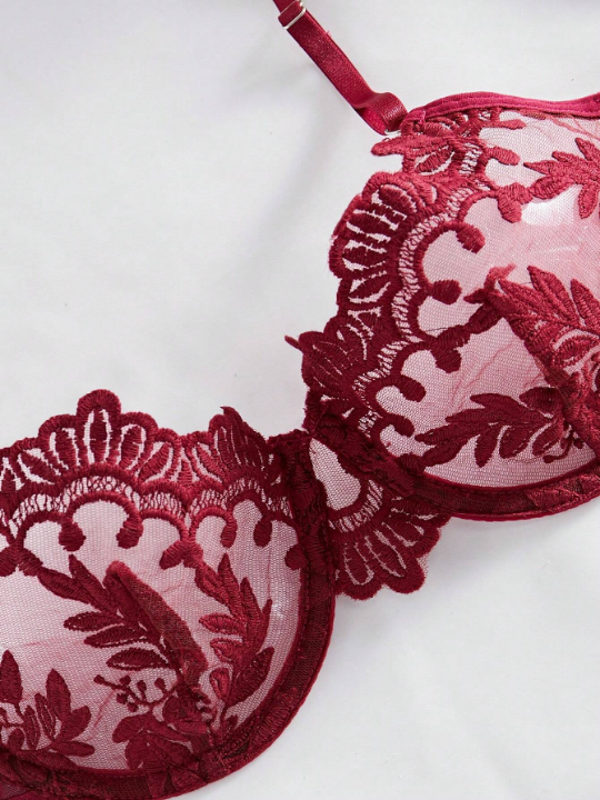 Pure Desire Women's Floral Embroidery Mesh Lingerie Two-Piece Set With Underwire And Thong