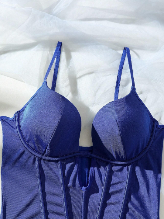 Color: Royal Blue Style: Fantasy-Mellow Type: Sexy Sets Neckline: Spaghetti Strap Details: Cut Out Number of Pieces: 3 Piece Set Bra Type: Plunge Panty Type: Thongs Rise: Mid Rise Fabric: Medium Stretch Care Instructions: Hand wash,do not dry clean Sheer: No Tops Material: Knitted Fabric Tops Composition: 85% Polyester, 15% Elastane