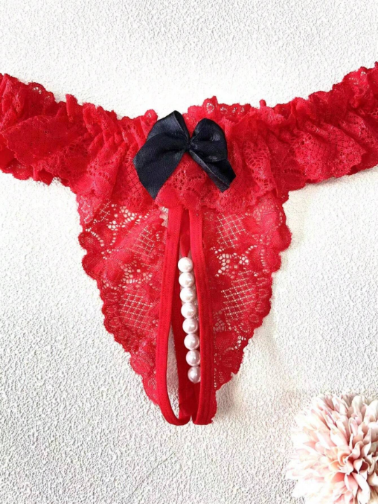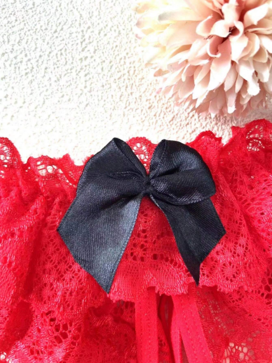 Color: Red Details: Bow Panty Type: Thongs Rise: Low Rise Fabric: High Stretch Material: Lace Composition: 85% Polyester, 15% Polyamide Care Instructions: Hand wash,do not dry clean Sheer: Semi-Sheer