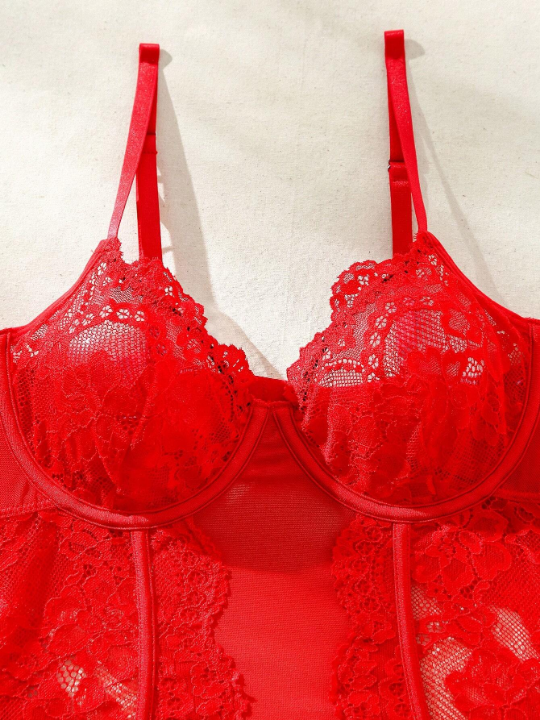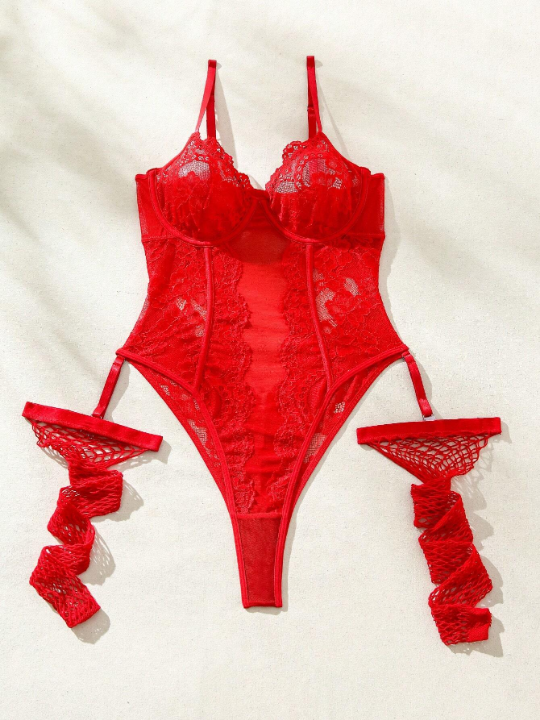 Color: Red Style: Fantasy-Elegant Type: Teddies Neckline: Spaghetti Strap Details: Contrast Lace Number of Pieces: 3 Piece Set Wires: Underwire Cup Type: 3/4 Cup Fabric: Medium Stretch Care Instructions: Hand wash,do not dry clean Bodysuits Material: Knitted Fabric Bodysuits Composition: 90% Polyamide, 10% Elastane