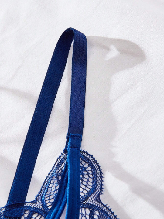 Color: Navy Blue Neckline: Spaghetti Strap Type: Sexy Sets Pattern Type: Plain Bra Type: Bralettes Panty Type: Thongs Number of Pieces: 2 Piece Set Rise: Mid Rise Details: Contrast Lace, Cut Out, Scallop Fabric: Slight Stretch Material: Lace Composition: 86% Polyamide, 14% Elastane Care Instructions: Hand wash,do not dry clean