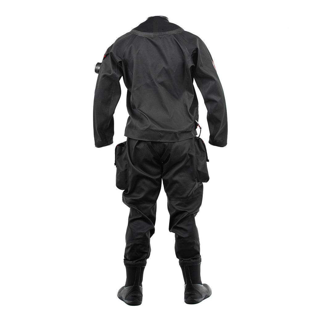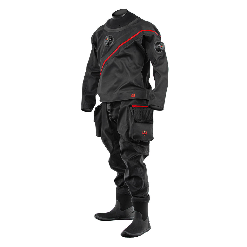 Lightweight and durable, the 901 Series Drysuit will provide you with guaranteed comfort during your diving adventures. The 901 is made from a trilaminate material that is about thirty percent lighter than common drysuit fabrics while maintaining the same strength. Areas that are susceptible to wearing such as the knees, elbows, and shoulders are reinforced with abrasion-resistant material. Seams are fortified inside of the suit with seal tape for waterproofness and to prevent wear. All suits undergo an extensive leak test before leaving the factory. Available in sizes XS to 2XL, with short and tall versions available for each size. Custom “made-to-measure” suits are available for divers that do not fit a standard size. The 901 Series Drysuit comes with a thirty one inch low pressure inflator hose, deluxe five millimeter hood, and a thirty-five liter dry bag for storage.