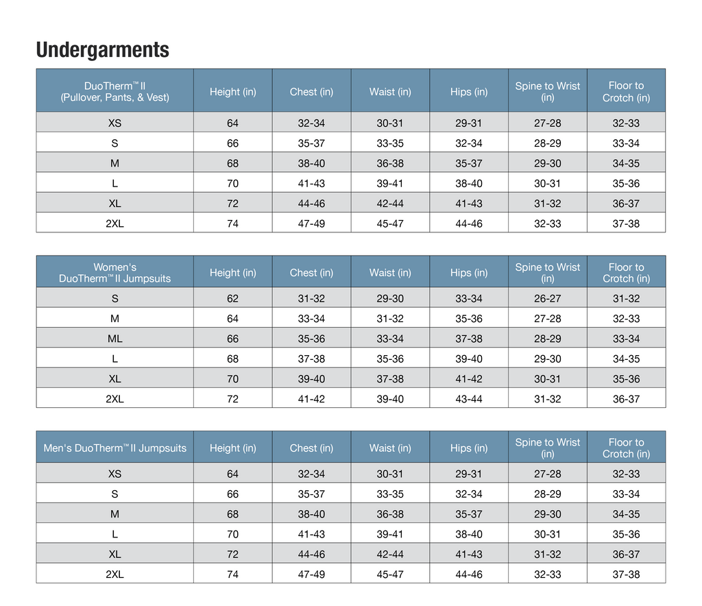 The DuoTherm II system is versatile for layering so you can adjust the undergarments to your personal comfort level.