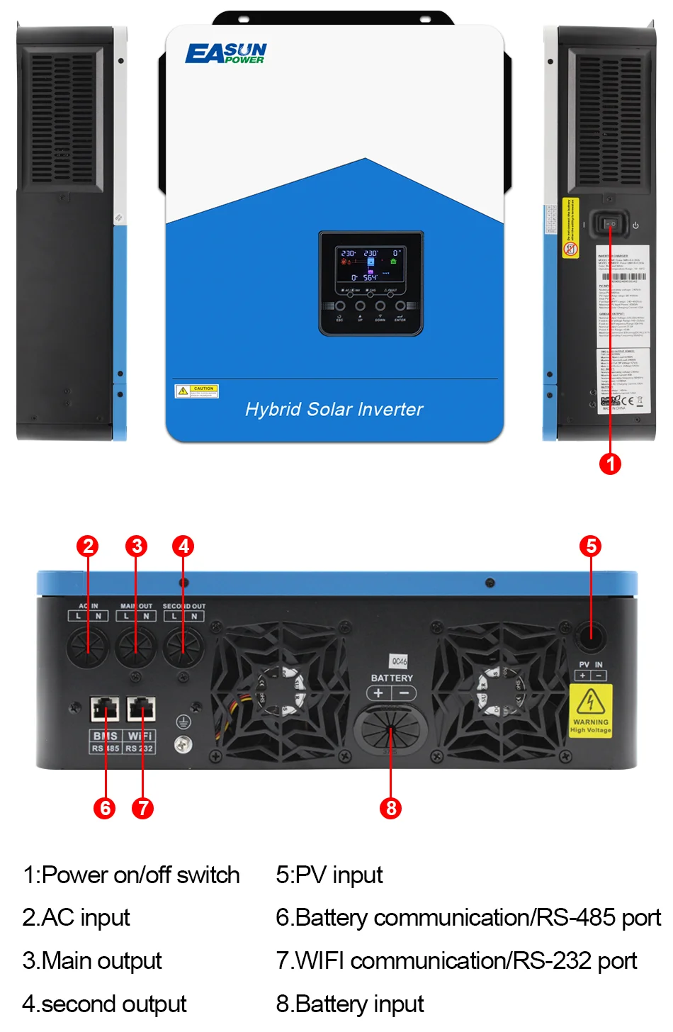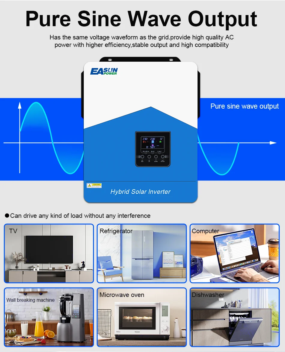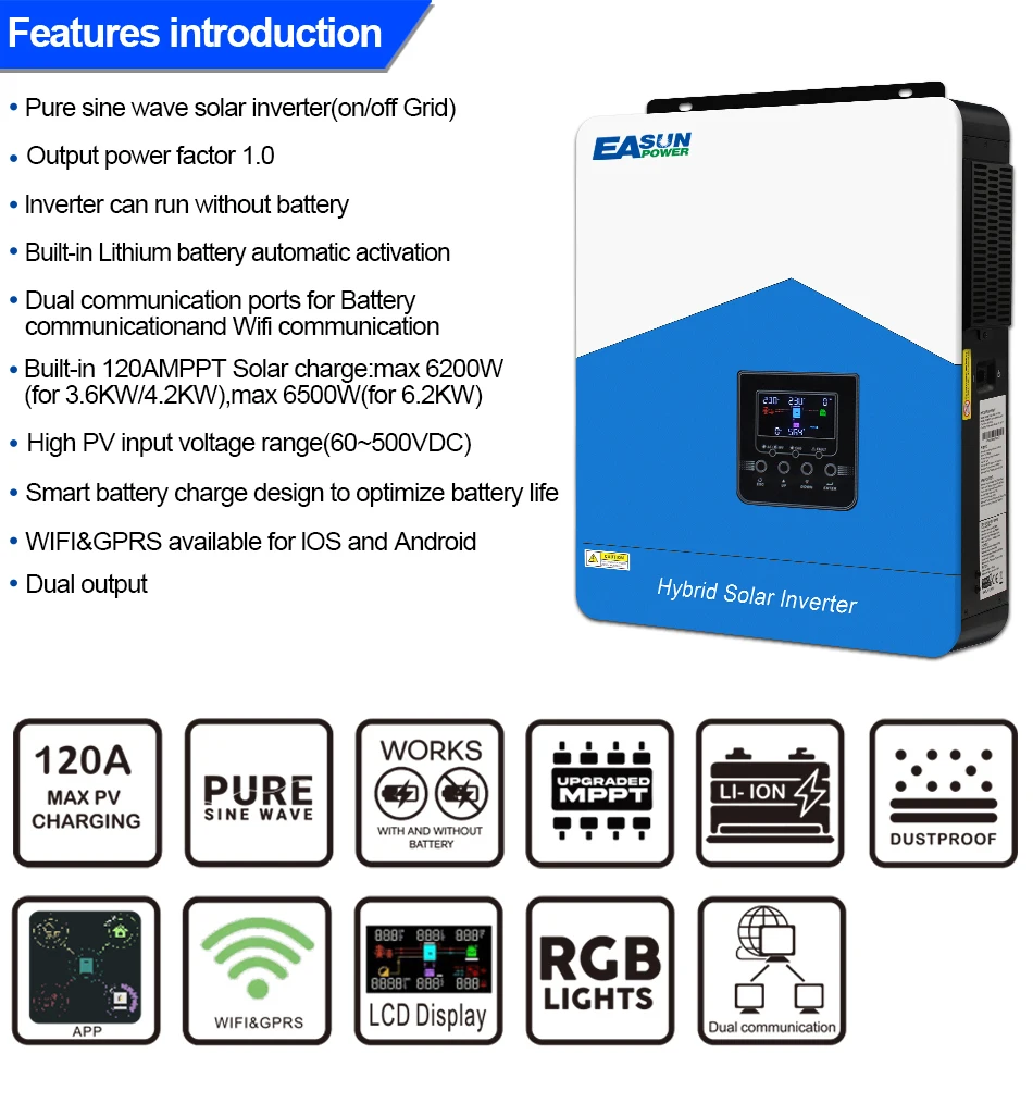 EASUN 6.2KW 4.2KW Hybrid Solar Inverter 3KW MPPT 120A 55V to 450VDC PV Input 220VAC 48VDC 2.2KW Solar Battery Charger with WIFI