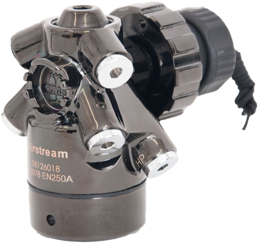 The Airstream Overbalanced and Environmentally sealed first stage is made through a forging process allowing optimized hose routing. The low pressure ports are angled 30 degrees down and 23 degrees out to allow hose routing directly over the shoulders. The high pressure ports are angled down 45 degrees to keep gauges closer to the divers hip and body. This process also allows air flow to be channeled through larger passages combined with the overbalanced diaphragm creates the lowest Work Of Breathing effort (WOB) 0.80 Joules per liter in all conditions and temperatures. Built into the front of the body of the Airstream is a forged heat transfer keeping warmer air inside and forcing cold out allowing this regulator to perform in the coldest conditions where others fail.