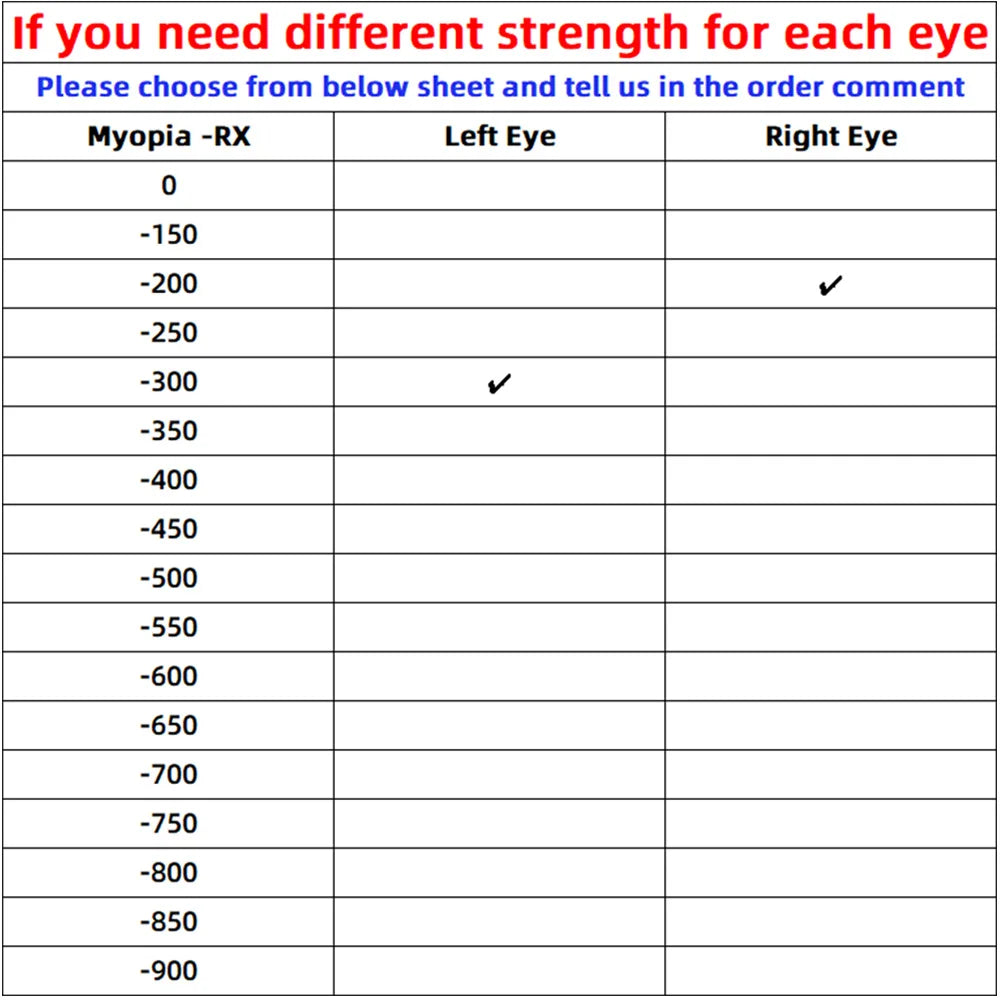 If your eyes have different degrees of myopia, pls choose item " Dfiferent Power",and left message on order notes about the left eye moypia and right eye myopia Strength.