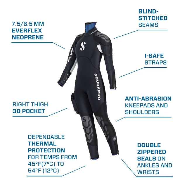 Offering a snug-fitting, flexible dive suit with good thermal properties and minimal water intrusion, the NovaScotia semi-dry is the perfect solution for staying very warm and relatively dry while virtually eliminating hydrodrag, radically improving a diver's ability to move easily through the water. With its 7.6/6.5mm thickness, easy-zip waterproof YKK Aquaseal Vislon zipper, improved plush lining to increase warmth and stretch, and a long list of convenience features, the NovaScotia is the diver's answer to a comfortable, affordable semi-dry suit. Positioned between a traditional wetsuit and a neoprene drysuit, the NovaScotia delivers the best of both worlds in cold water, temperate water, and multi-dive protection.