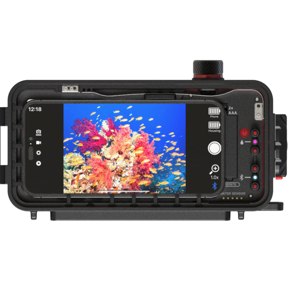 The app playback mode displays photos and videos in full size with a vertical thumbnail strip, making it easy to find your images. Videos are played automatically when selected. All files are also saved to the phone's movie roll. The SportDiver Ultra casing automatically connects to your smartphone and the SportDiver app via Bluetooth® Low Energy (LE) 5 wireless technology. There are no cables or buttons touching the phone and power consumption is extremely low for both the phone and the housing, which is powered by two AAA batteries that last for more than 50 hours of continuous use.