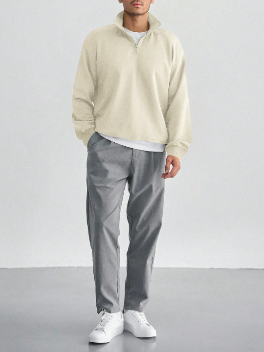 Color: Beige Style: Casual Type: Half Placket Pattern Type: Plain Details: Zipper Neckline: Collar Sleeve Length: Long Sleeve Sleeve Type: Drop Shoulder Length: Regular Fit Type: Regular Fit Fabric: Non-Stretch Material: Knitted Fabric Composition: 97% Polyester, 3% Elastane Care Instructions: Machine wash, do not dry clean Temperature: Late Fall 10-17℃/50-63℉ Sheer: No