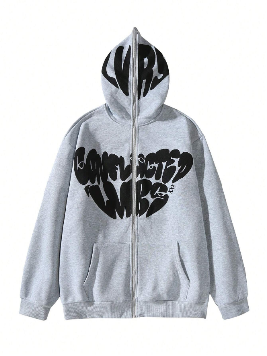 Color: Grey Style: Casual Type: Zip Up Pattern Type: Letter Details: Drawstring, Pocket, Zipper Neckline: Hooded Sleeve Length: Long Sleeve Sleeve Type: Drop Shoulder Length: Regular Fit Type: Regular Fit Fabric: Slight Stretch Material: Knitted Fabric Composition: 100% Polyester Care Instructions: Machine wash or professional dry clean Temperature: Late Fall 10-17℃/50-63℉ Sheer: No