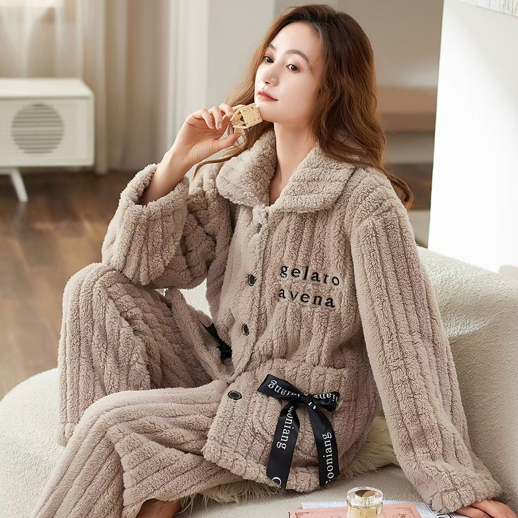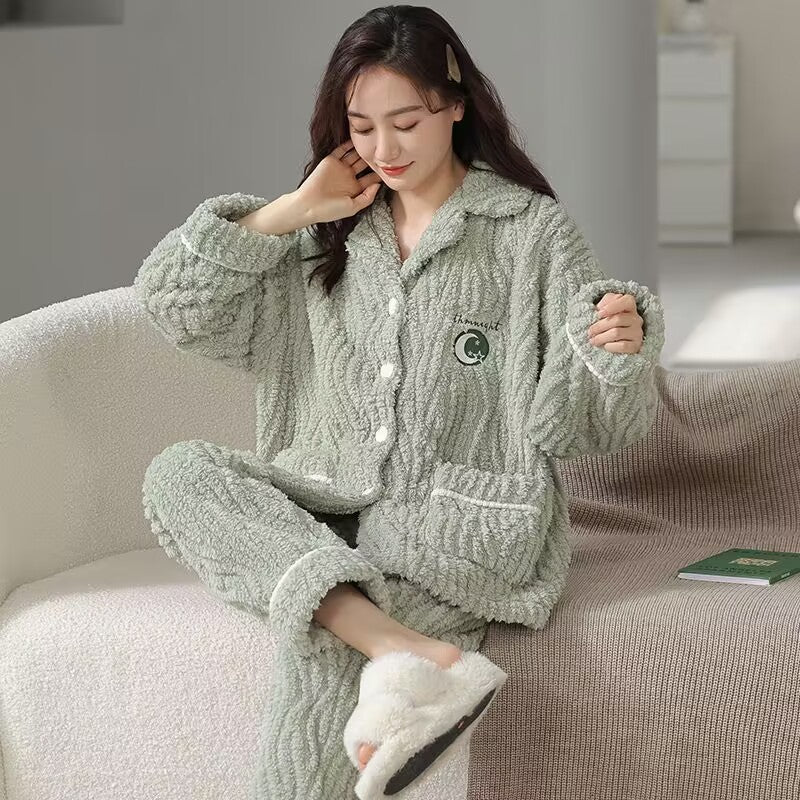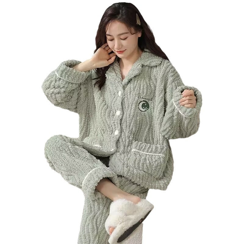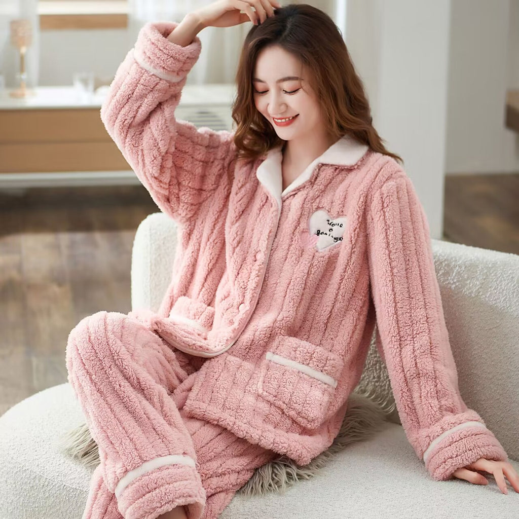 Seriously, this pajama set is straight-up fire. The coral fleece fabric is unbelievably soft, like being hugged by a cloud. Whether you're binge-watching your favorite shows, having a late-night study sesh, or just chilling with your squad, this set is guaranteed to keep you comfy and looking effortlessly stylish. And the details? Impeccable. With its classic collared design and relaxed fit, it's the perfect blend of cozy and chic. Trust us, you'll never want to take it off. Get ready to upgrade your loungewear game with the ultimate pajama set that's as comfy as it is cute.