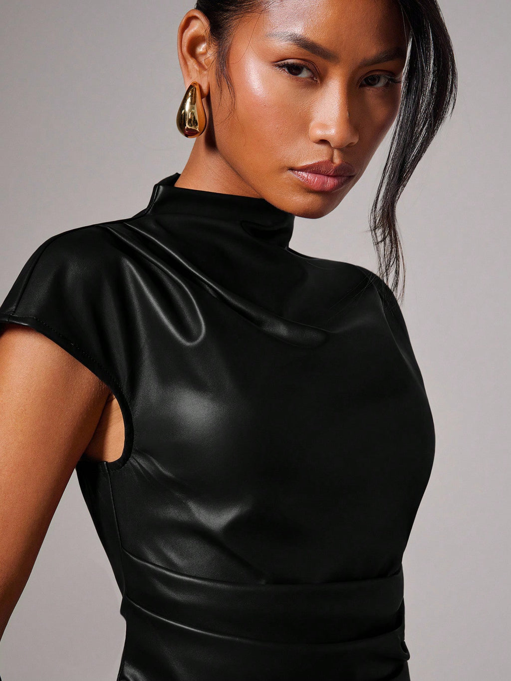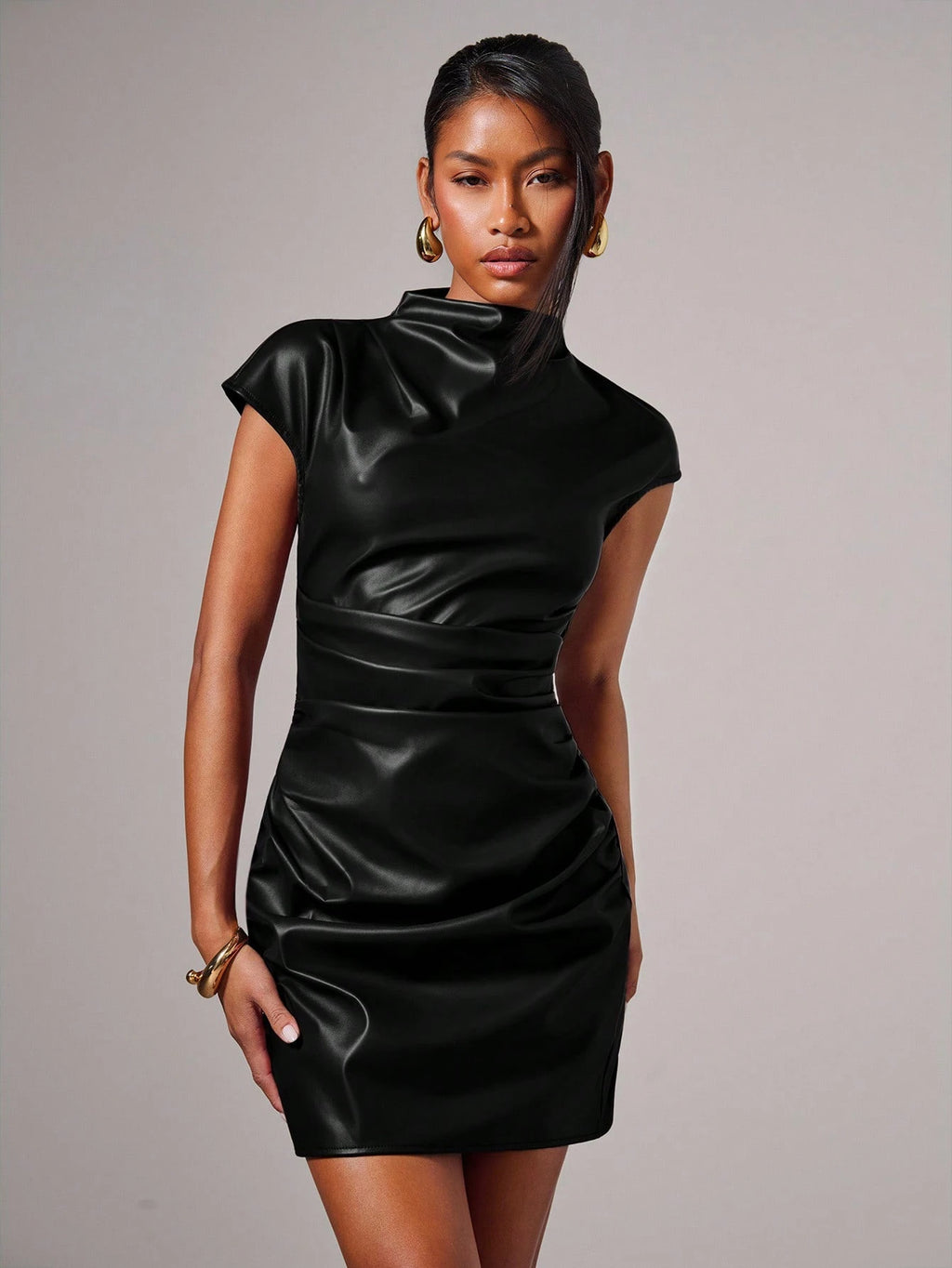 COSMINA Women's Solid Color Stand Collar Puff Sleeve Elegant PU Pleated Mini Dress Black