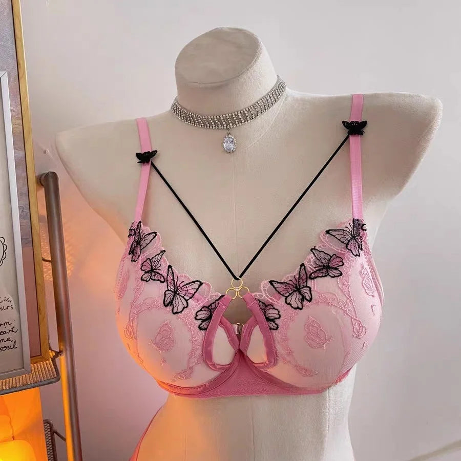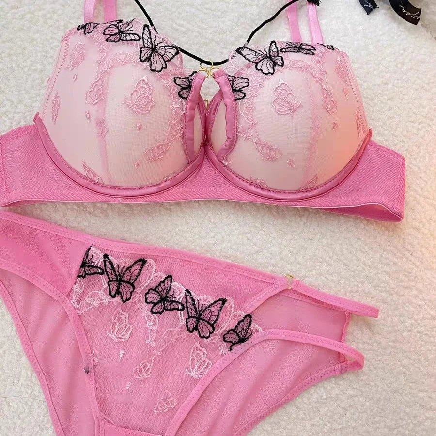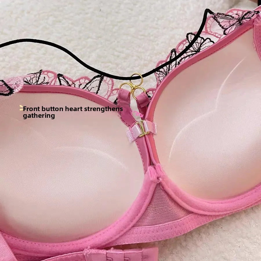 Sexy Butterfly Embroidery Pink Bra Set Women's with Steel Ring Thickened Gathered Large Chest Effect Underwear Set Lace Fabric