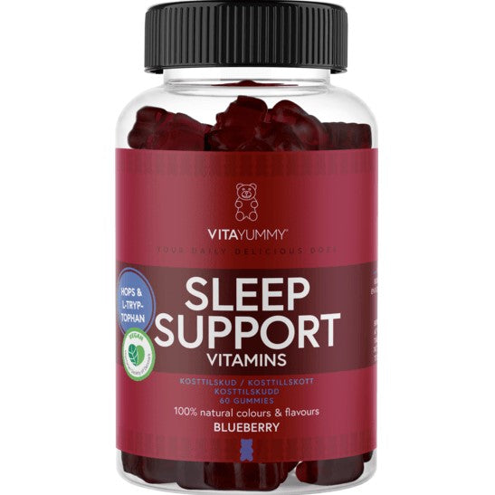 VitaYummy Sleep Support contains a unique combination of L-tryptophan, hops and B6.