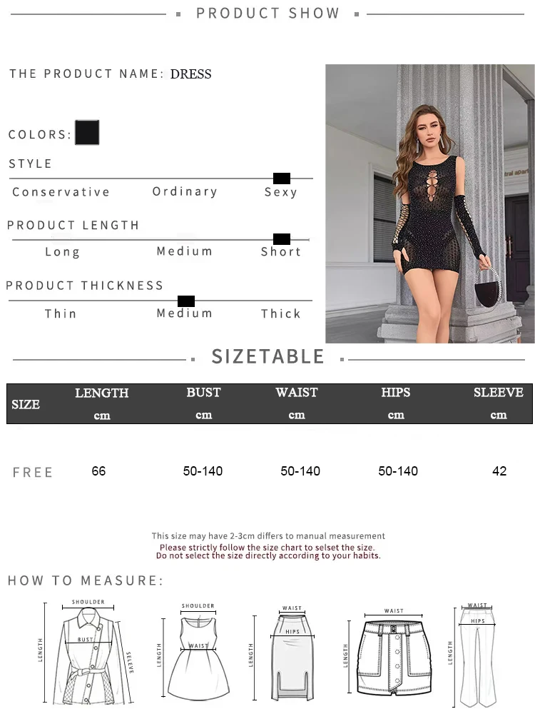 2pcs Women's Sexy Dress Rhinestone Hollow Out Stretchy Dress Set Slim Fit See-Through Mini Dress & Gloves Party Club Street Wear