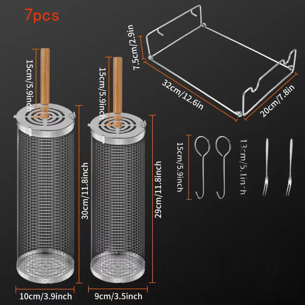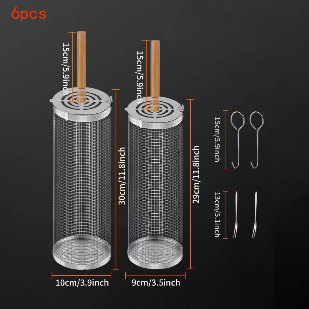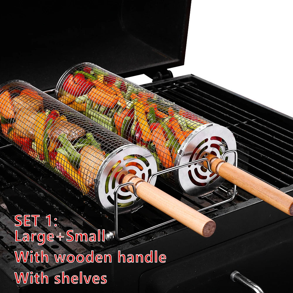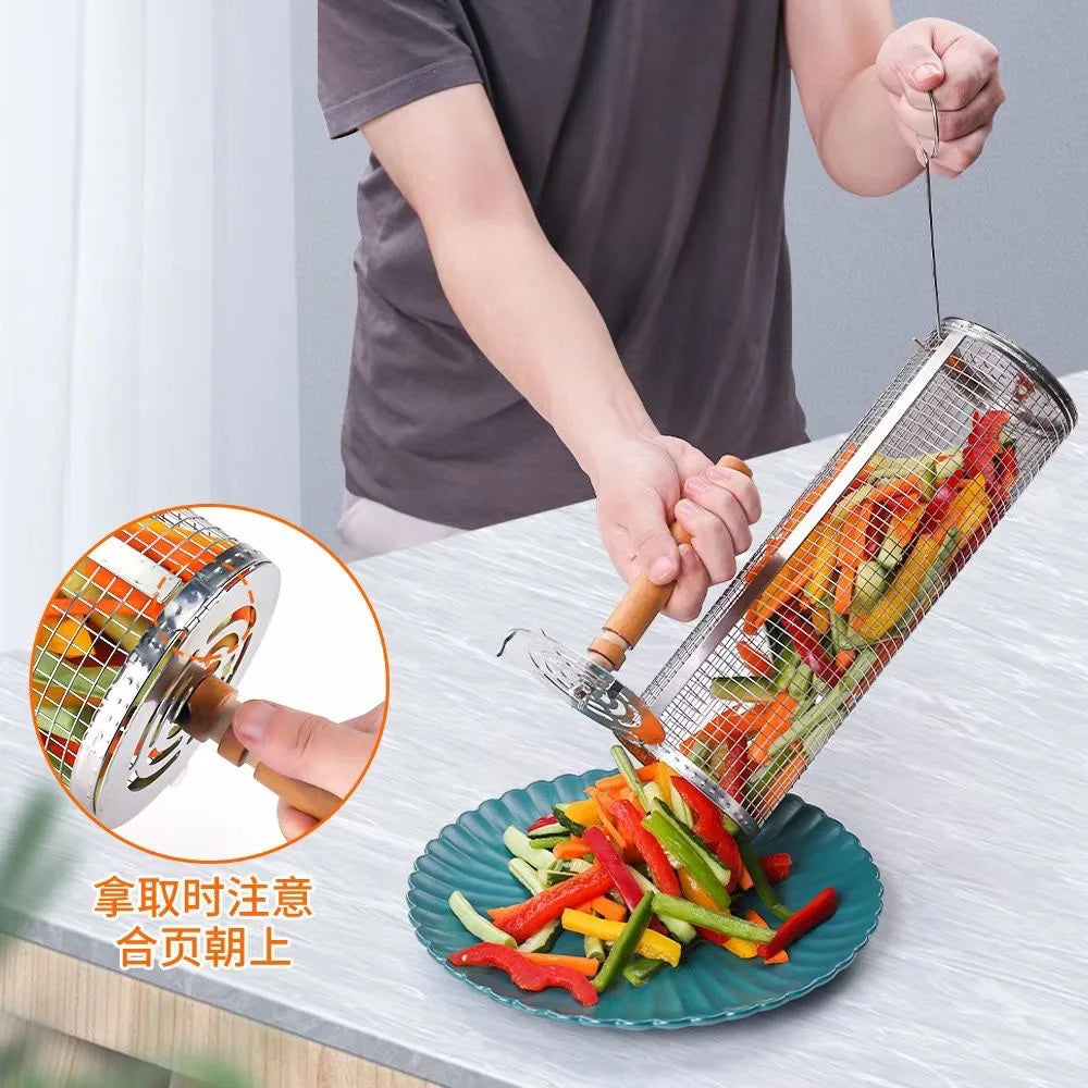 BBQ Basket Set Stainless Steel Rolling Grilling Basket Wire Mesh Cylinder Grill Basket Outdoor Camping BBQ Rack with Wood Handle