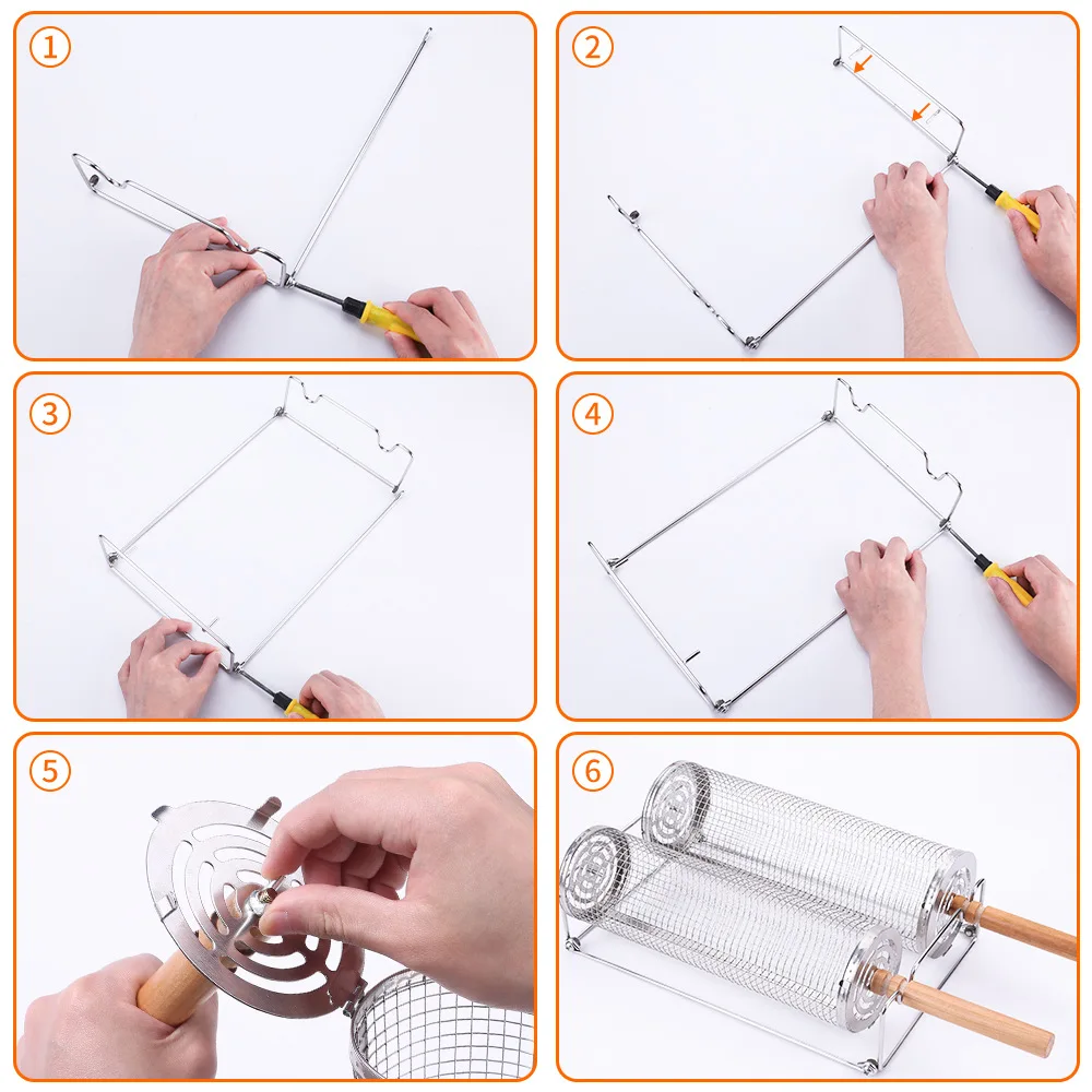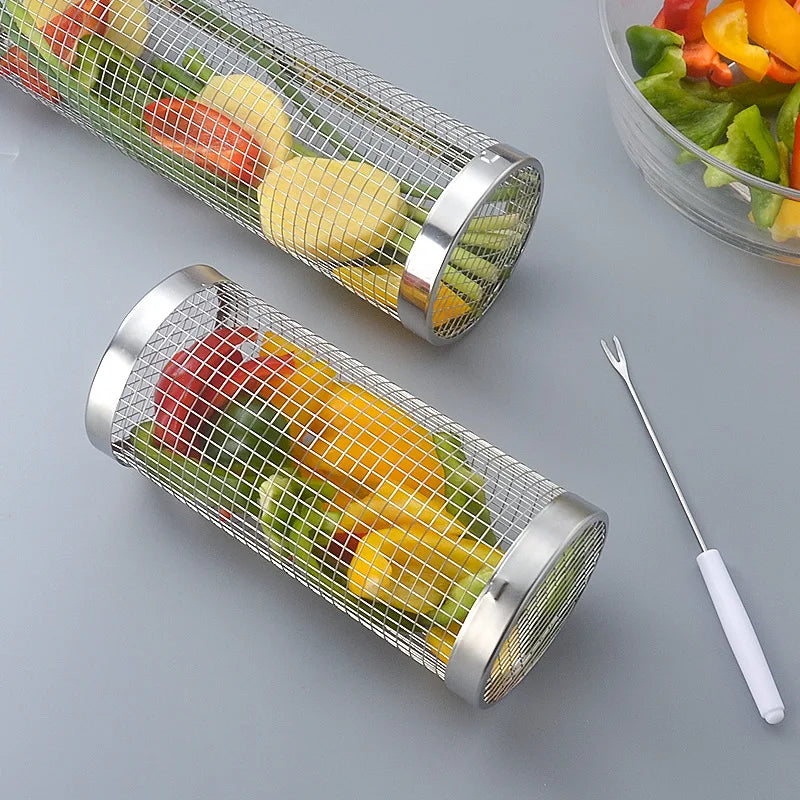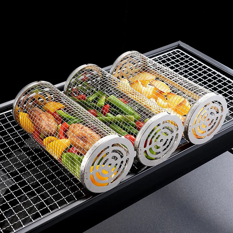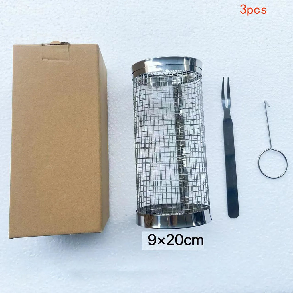 BBQ Basket Set Stainless Steel Rolling Grilling Basket Wire Mesh Cylinder Grill Basket Outdoor Camping BBQ Rack with Wood Handle