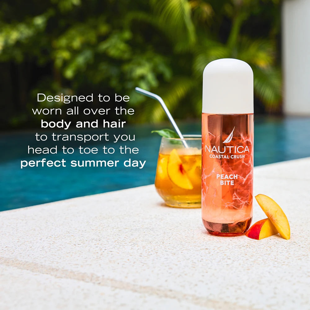 Let yourself be embraced by a fragrance that makes you feel great around the clock. Nautica Coastal Crush Peach Bite is a body spray for women that stands for optimism and a feeling of complete happiness.
