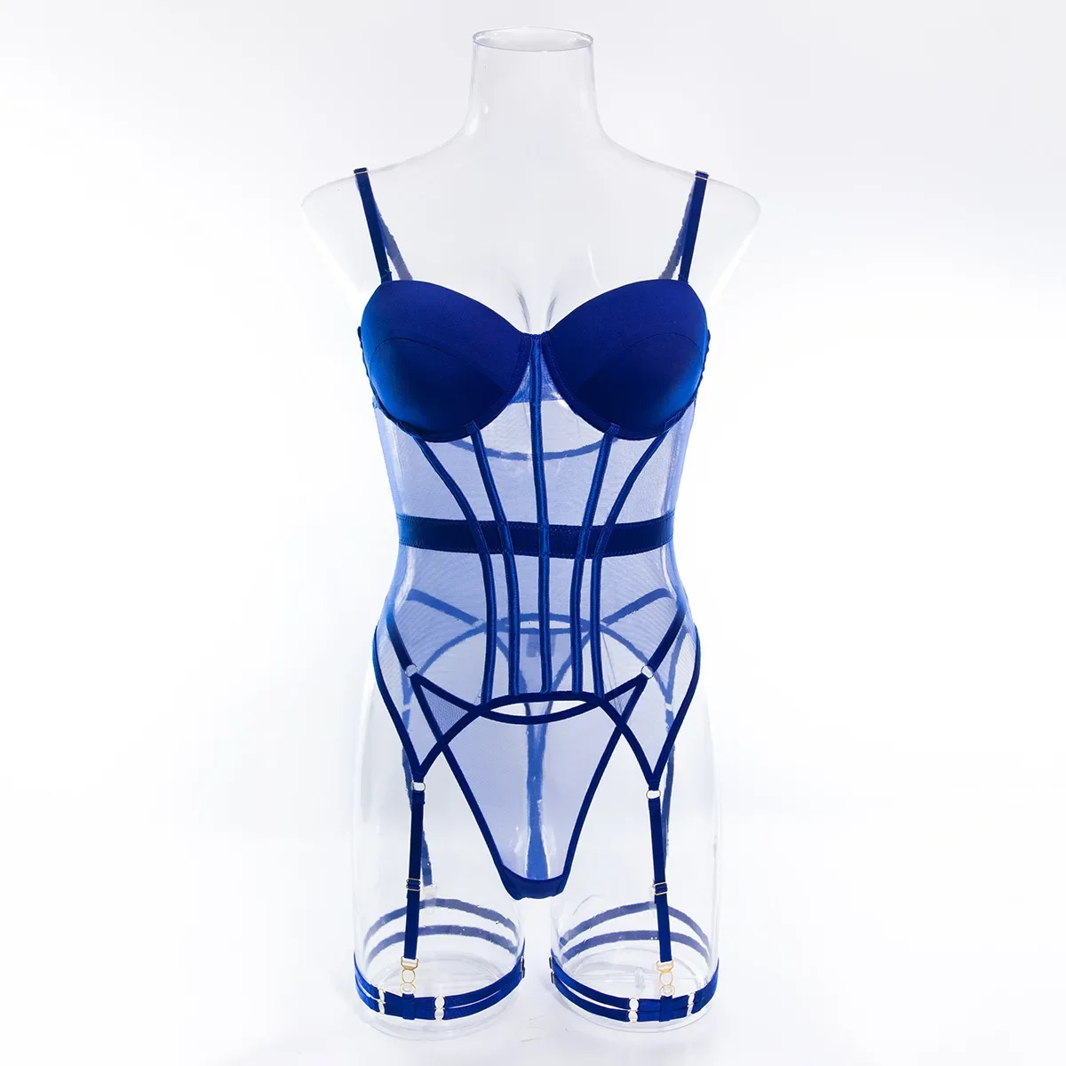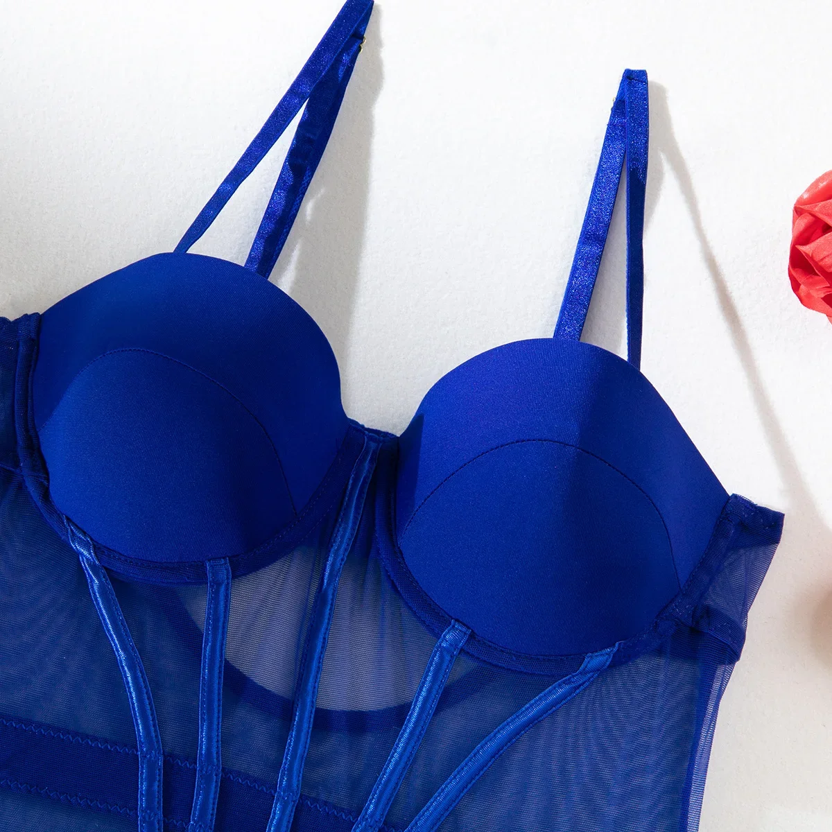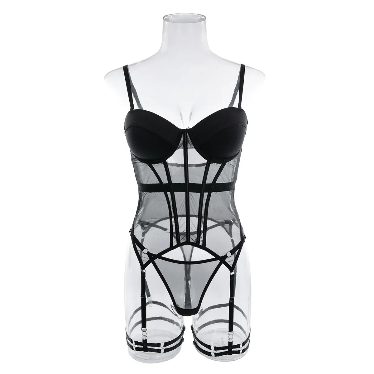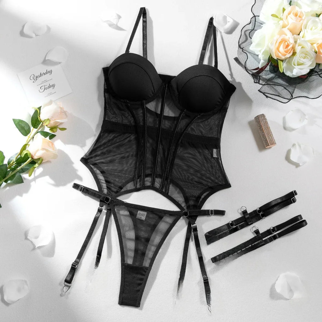 Sexy Transparent Mesh Splicing Women's Cotton Gathered Body Suit Bra Underpant Nylon Fabric Thin Style Summer Fashion Crossbody