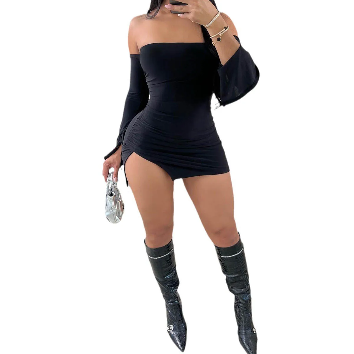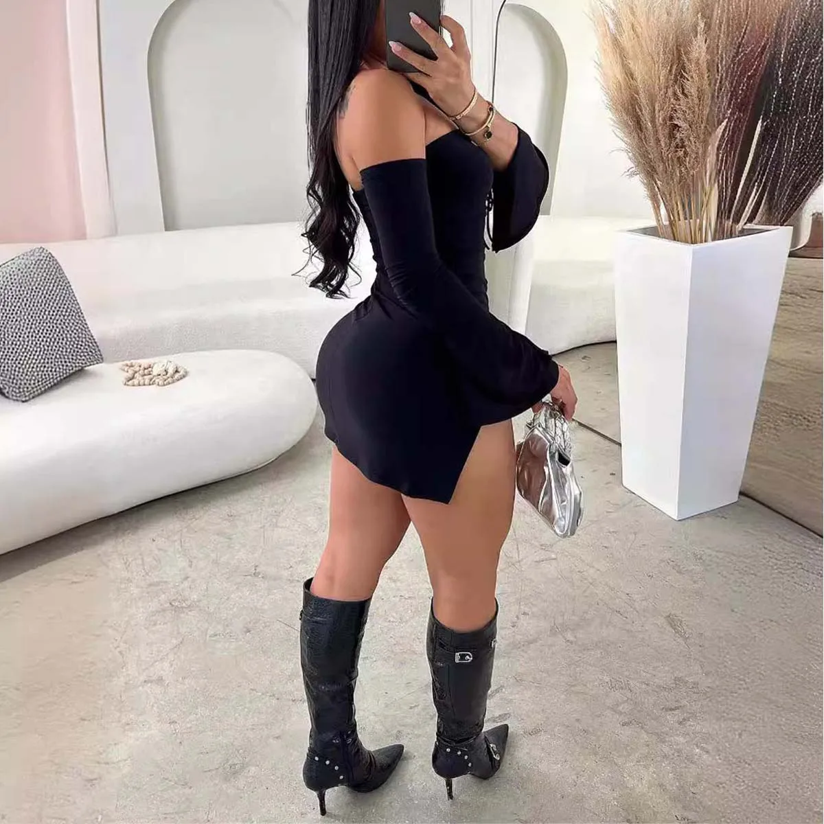 Women's Black Strapless Backless Mini Dress Off-Shoulder Long Sleeve Bodycon Club Party Dress for Women