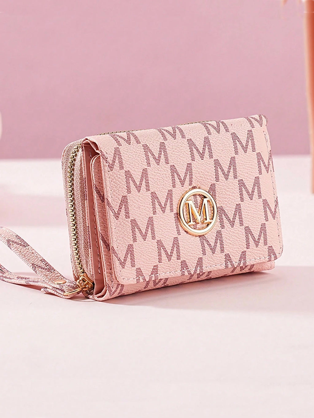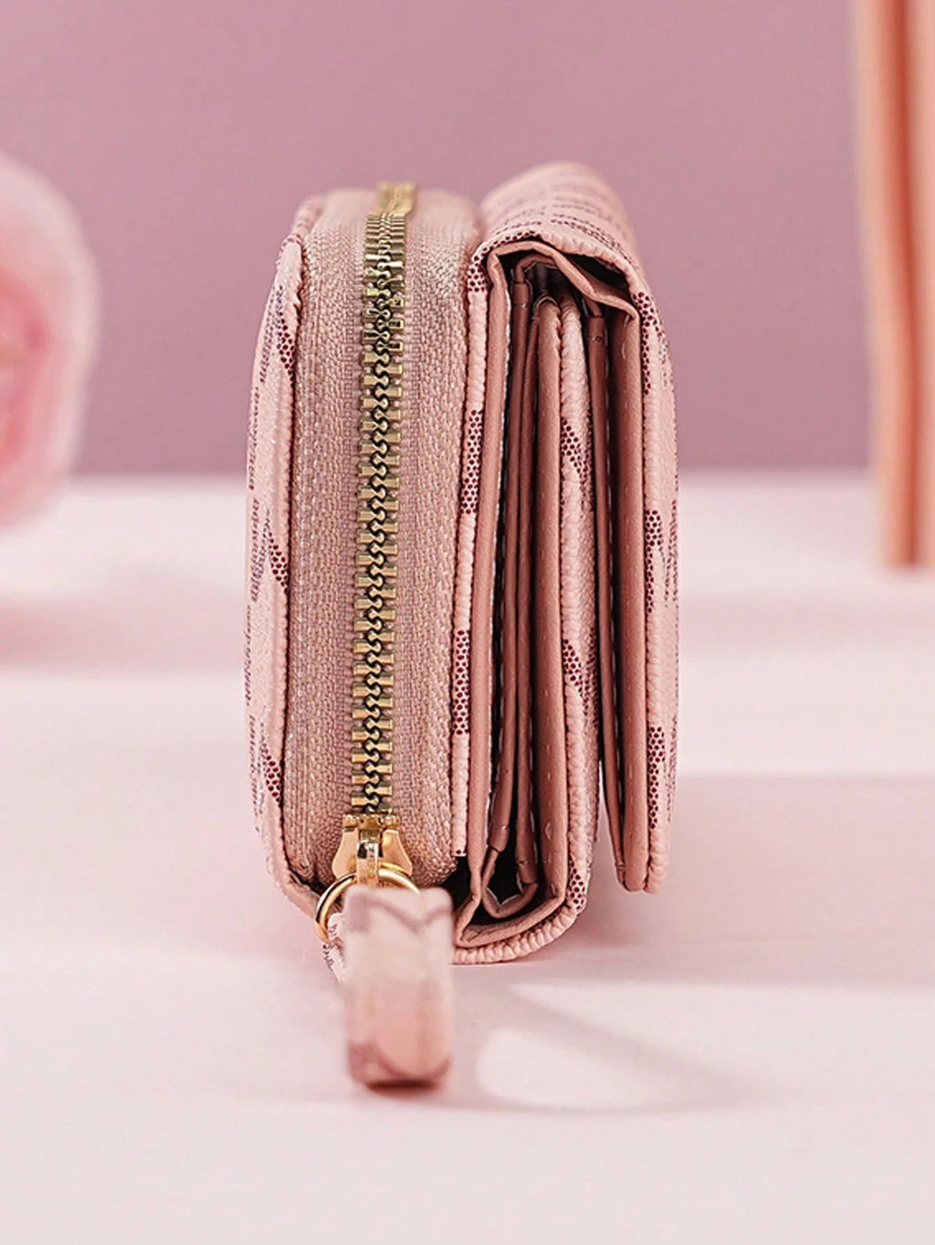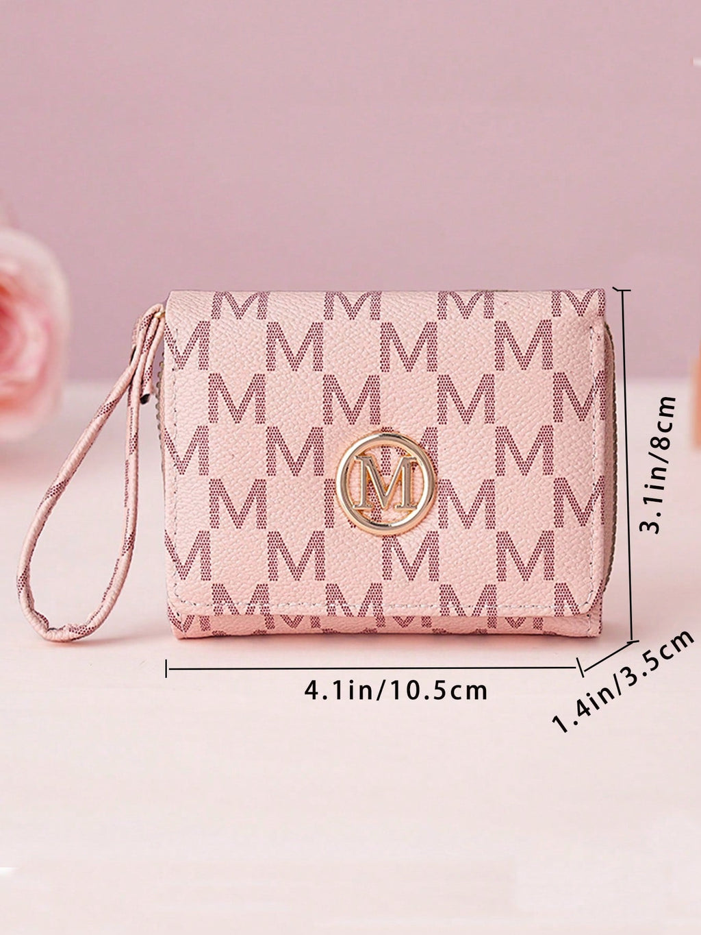 Type : Small WalletDetails : LetterPattern Type : All Over PrintStyle : CasualFeatures : FoldableClosure Type : ZipperColor : PinkStrap Type : ChainMaterial : PU LeatherGender : Women