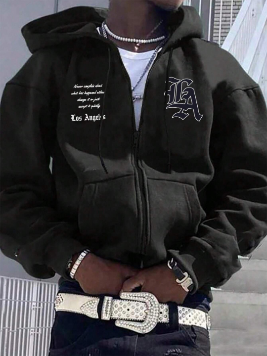 Color: Black Style: Casual Type: Zip Up Pattern Type: Slogan, Letter Details: Drawstring, Pocket, Zipper Neckline: Hooded Sleeve Length: Long Sleeve Sleeve Type: Drop Shoulder Length: Regular Fit Type: Loose Fabric: Slight Stretch Material: Fabric Composition: 100% Polyester Care Instructions: Machine wash or professional dry clean Temperature: Spring/Fall 18-25℃/63-77℉ Pockets: Yes Sheer: No